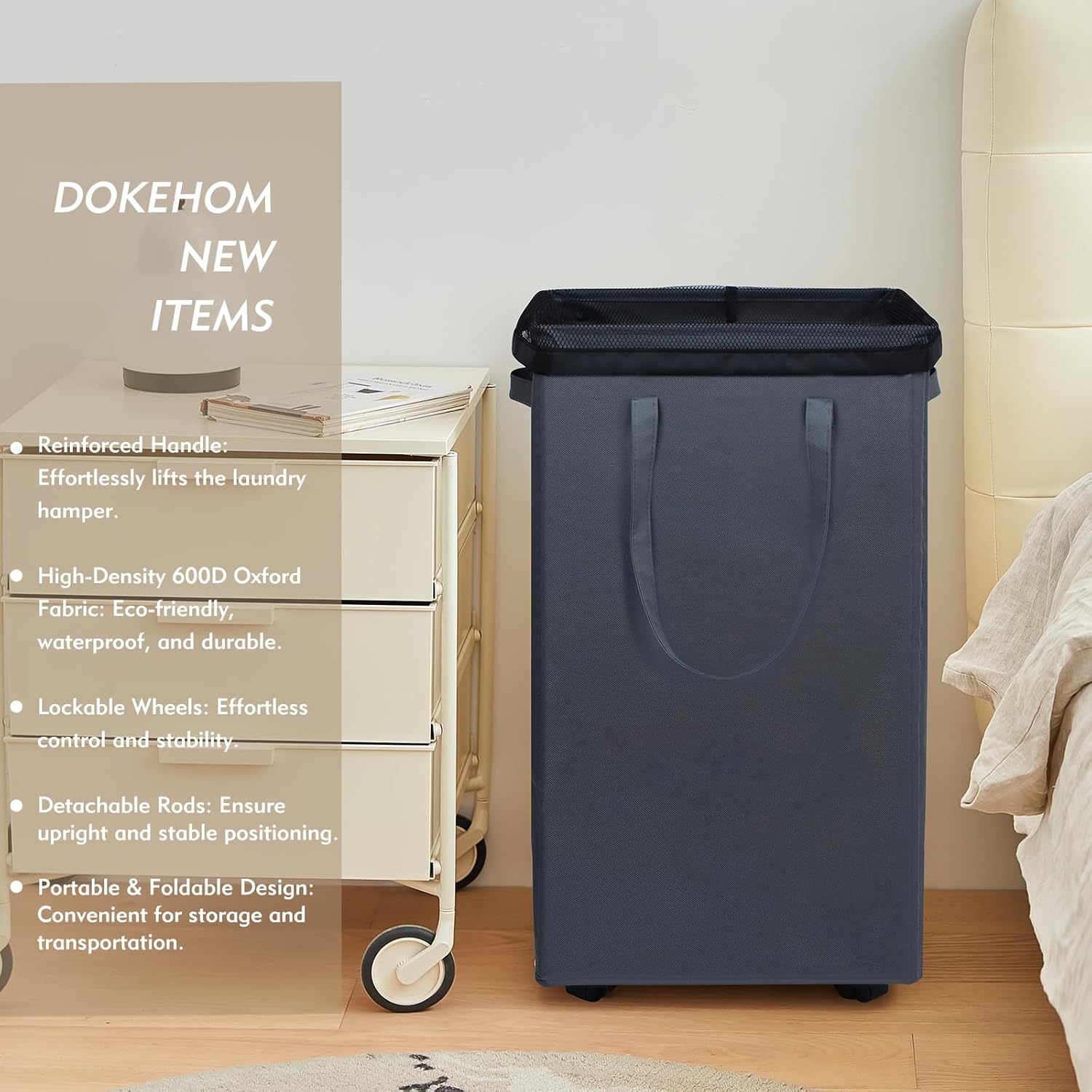 DOKEHOM 90L X-Large Laundry Basket with Removable Wash Bag on Wheels, Collapsible Rolling Laundry Hamper, Foldable Clothes Organizer, Folding Washing Bin (Grey)