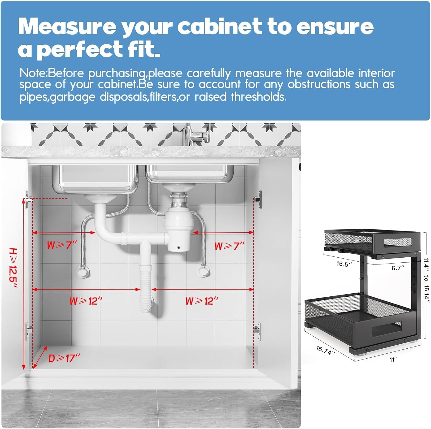 • 【Maximize Your Space】This organizer features an L-shaped design and 5-level adjustable height to optimize under-sink storage. The narrow top and wide bottom layout avoid pipes and garbage disposal, while providing ample space below for tall bottles. The 5-level height adjustment (11.4-16.14 inches) allows easy customization, adapting to complex pipe setups and ensuring efficient storage for items of various heights, maximizing vertical space and enhancing organization.