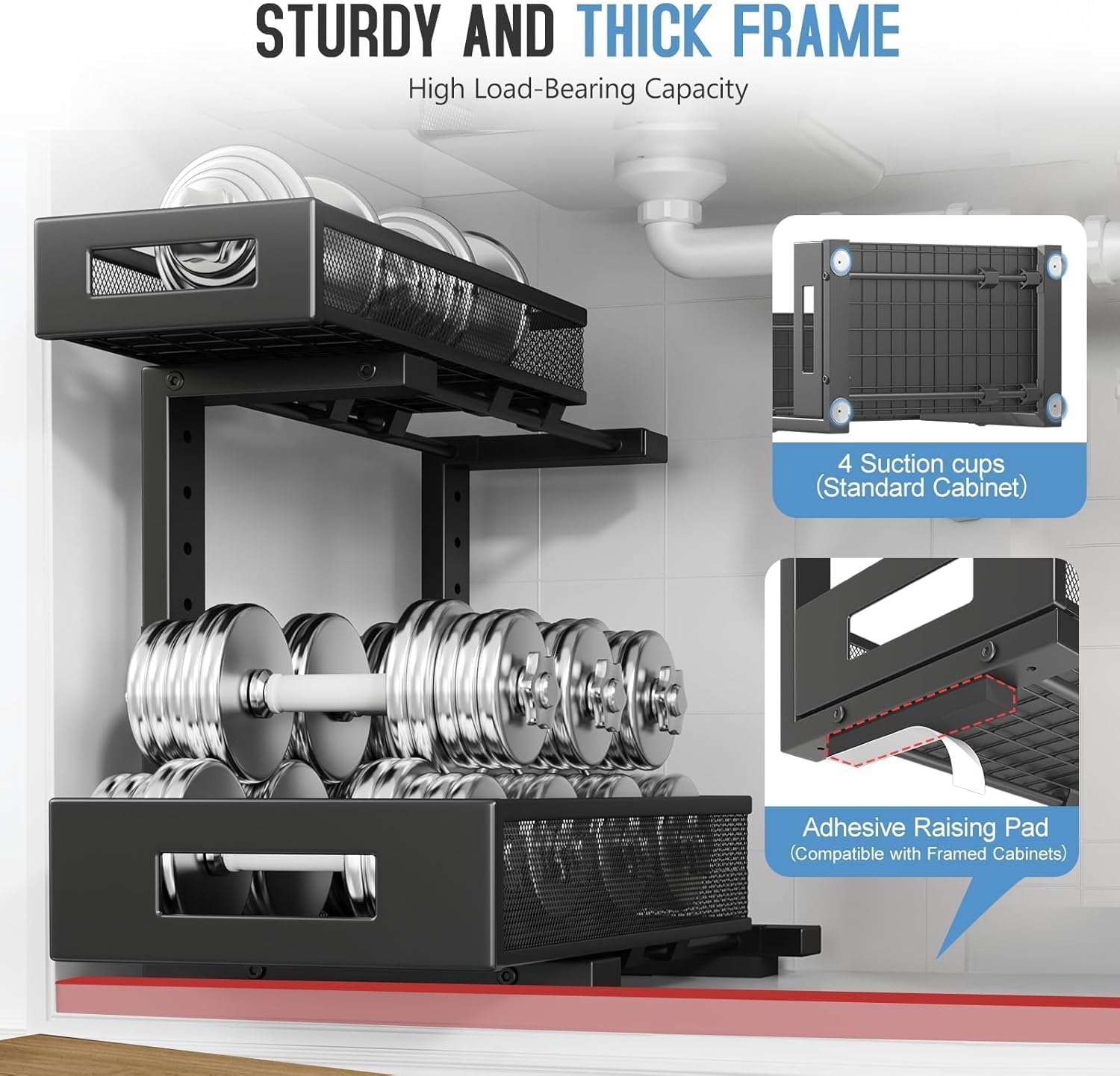 • 【2-Tier Pull-Out Design for Easy Access】This under-sink organizer features a double-layer pull-out design, allowing you to easily access items at the deepest part. The upgraded, thickened iron circular sliding rails ensure a smooth and seamless pulling experience, making each use effortless. The unique pull-out locking mechanism effectively prevents the drawers from being completely pulled out, avoiding the risk of items falling or structural damage caused by over-pulling, ensuring safer and more convenient use.