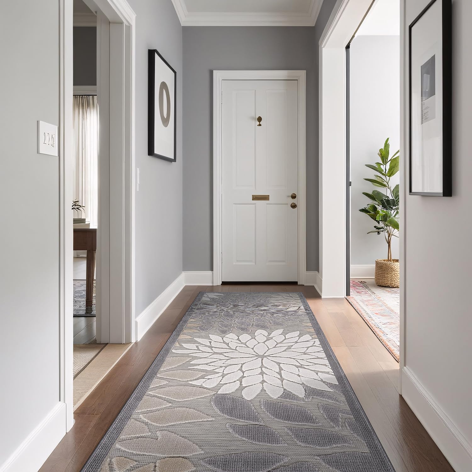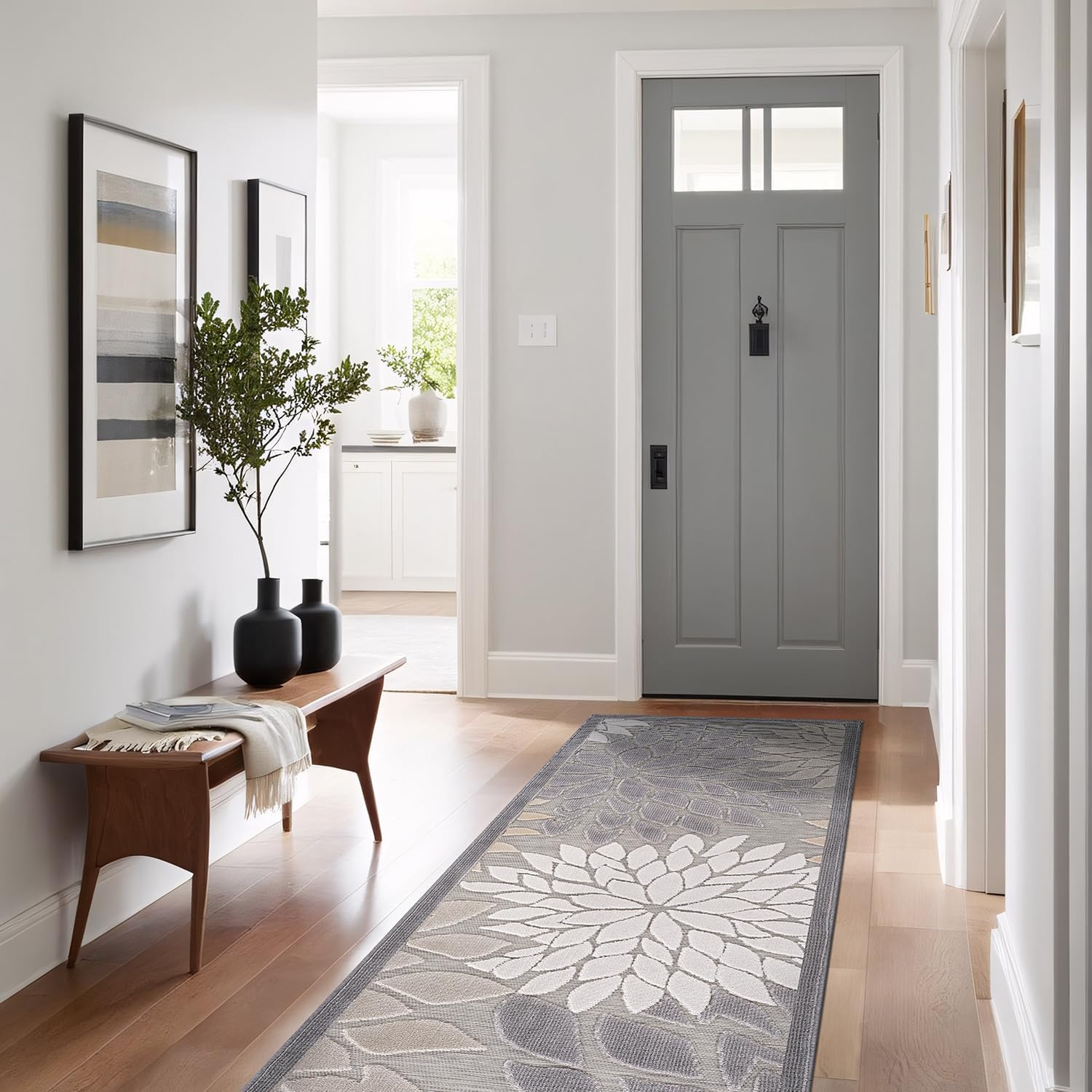 Beverly Rug Outdoor Runner Rug 2x7 Modern Floral Tropical Area Rugs for Indoor and Outdoor Patio Easy to Clean Non Shedding Living Room Porch Garden Washable Outside Carpet (2 x 7 Gray)