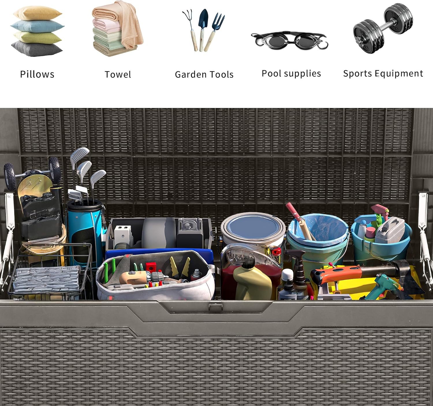 • Extra Seating: Doubling as a comfortable bench seat, this plastic deck box can support up to 485 pounds; Set it up in just 15-30 minutes, and enjoy its unique rattan-grain texture that seamlessly blends with any patio or deck decor in no time