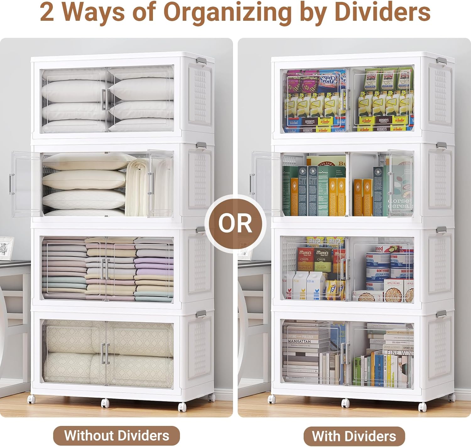 • 【Extra-Large Storage Bins With Dividers】BROVIEW storage bins offer an astonishing capacity of 200Qt/50Gal per tier. 4Pack foldable storage bin, equipped with doors and wheels, expands to generous dimensions of 33.5"L x 19"W x 69.3"H and can support a maximum weight of up to 120lb. Each tier is thoughtfully designed with a divider, enabling you to create two distinct compartments within a single level for organized storage. (Note: Each set includes ONLY ONE LID!)