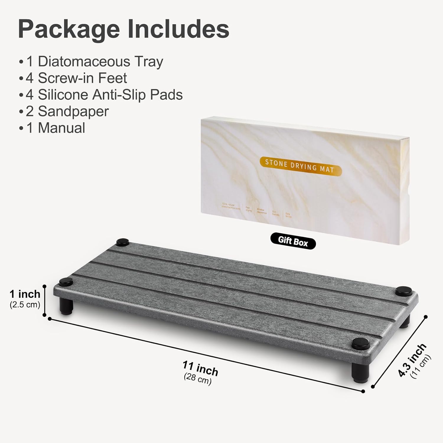 • What’s Included: One diatomaceous tray, four stainless steel screw sets, four silicone anti-slip pads, two sandpaper, and one manual. Tray size: 11 L x 4.3 W x 1 H inches.