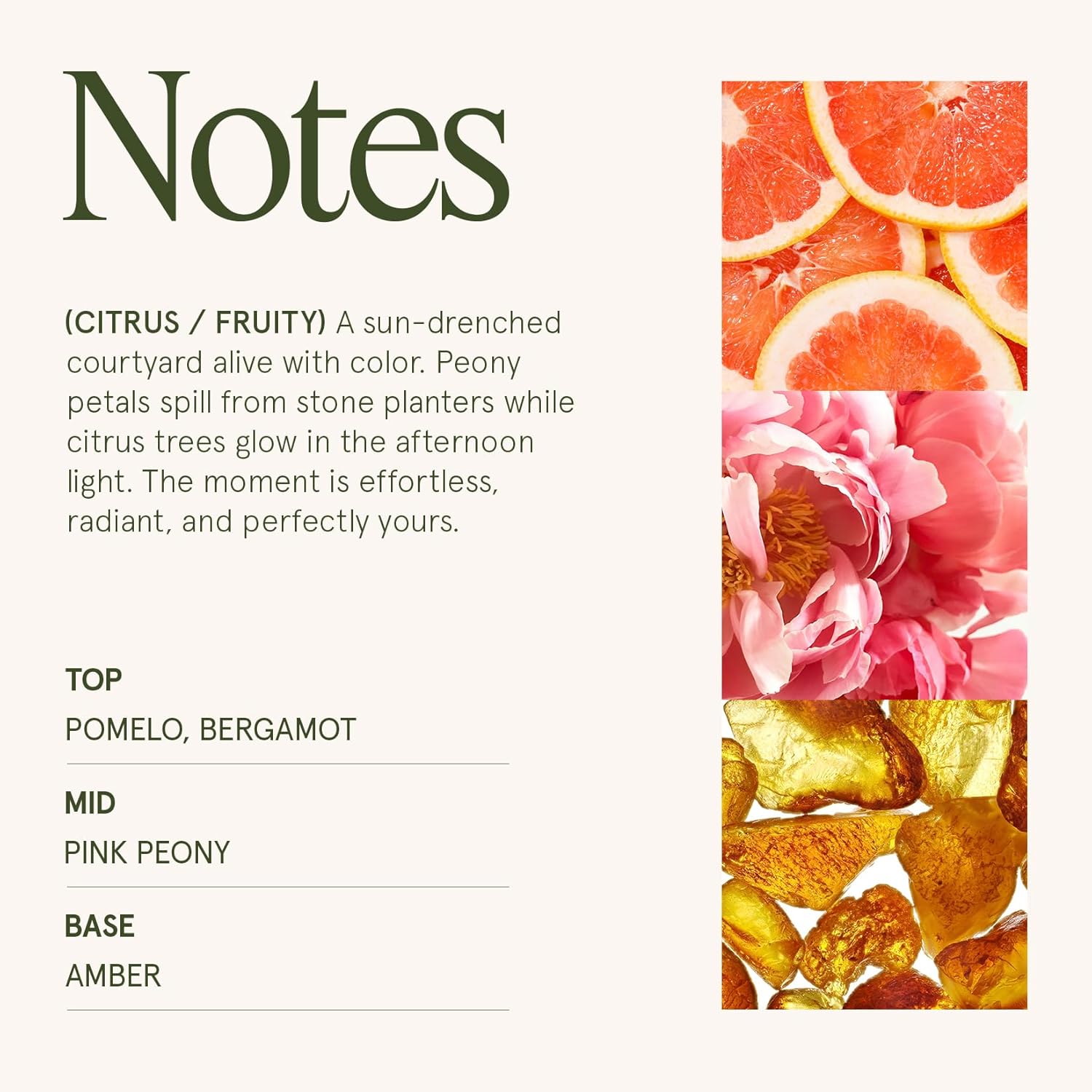 • CITRINE & PINK PEONY: A vibrant fragrance that opens with zesty pomelo, bergamot, and grapefruit, unfolds into a delicate bouquet of pink peony, white tea, and geranium, and finishes with warm cedarwood, amber, and cardamom