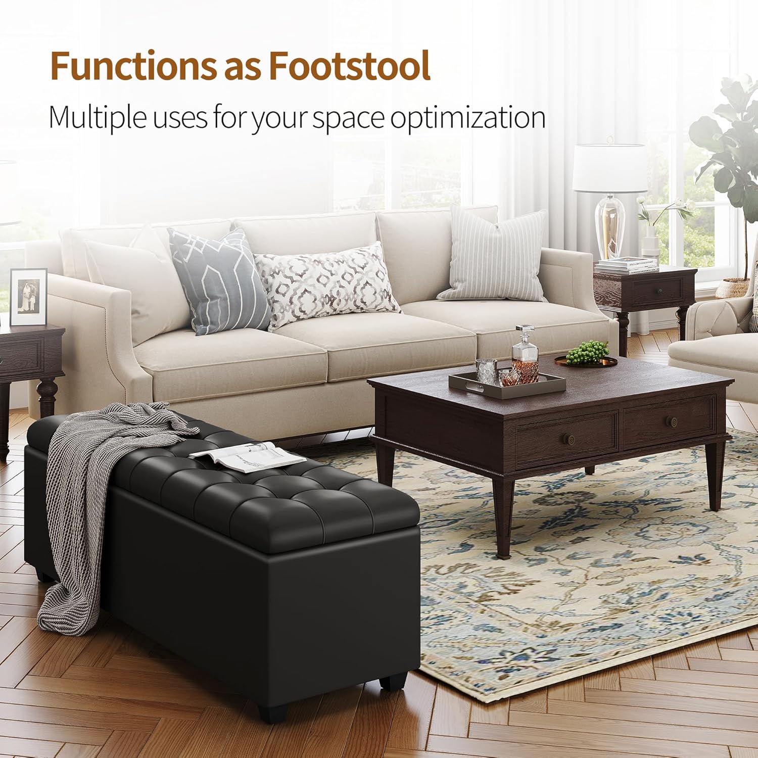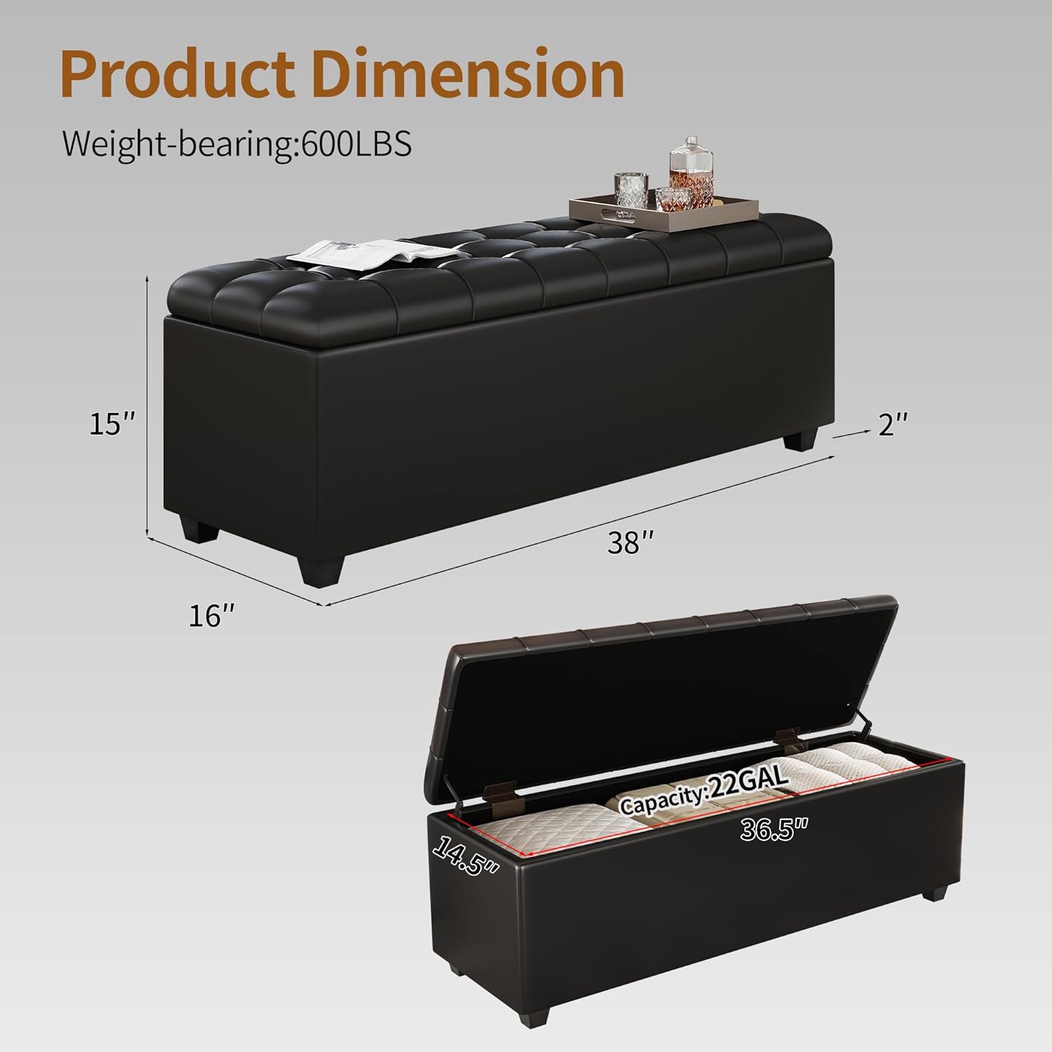 • 【 Spacious Storage 】 About 36.2" x 14.5" x 9.4" as its inner storage size,this 38 inch long storage ottoman bench with hinged lid provides you with lots of area to store things like toys,books,clothes,backpacks,blankets,shoes,seasonal items and more