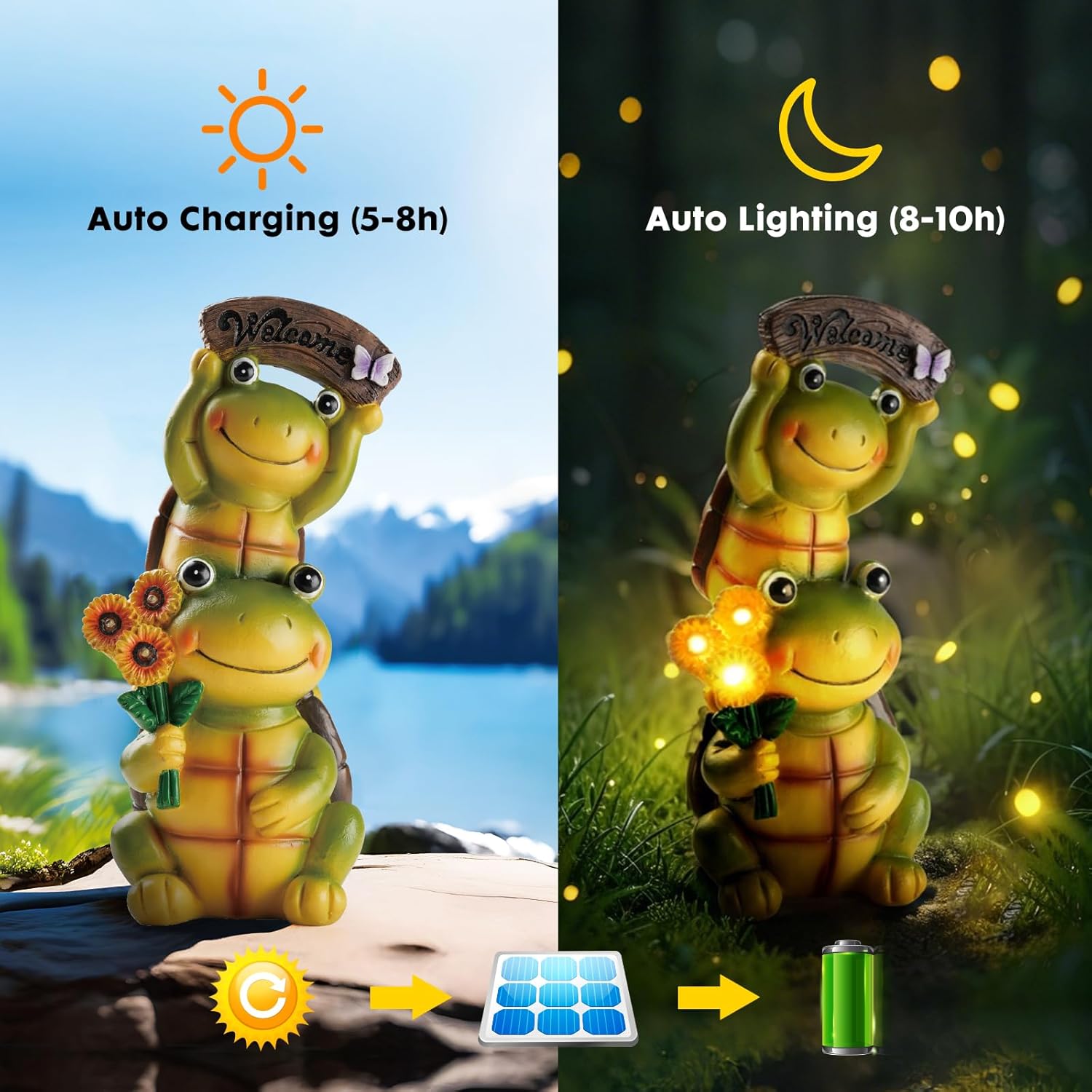 • Eco-friendly Solar Power: Equipped with an efficient solar panel, it absorbs sunlight during the day and automatically lights up at night. No batteries are needed, making it energy-saving and environmentally friendly.