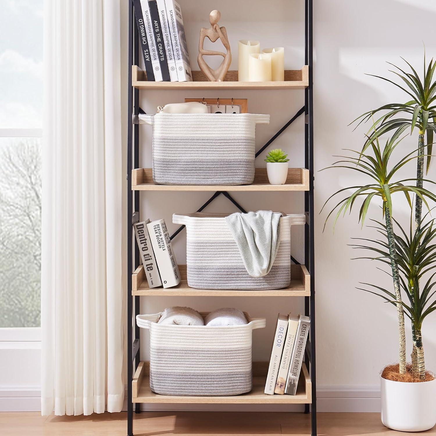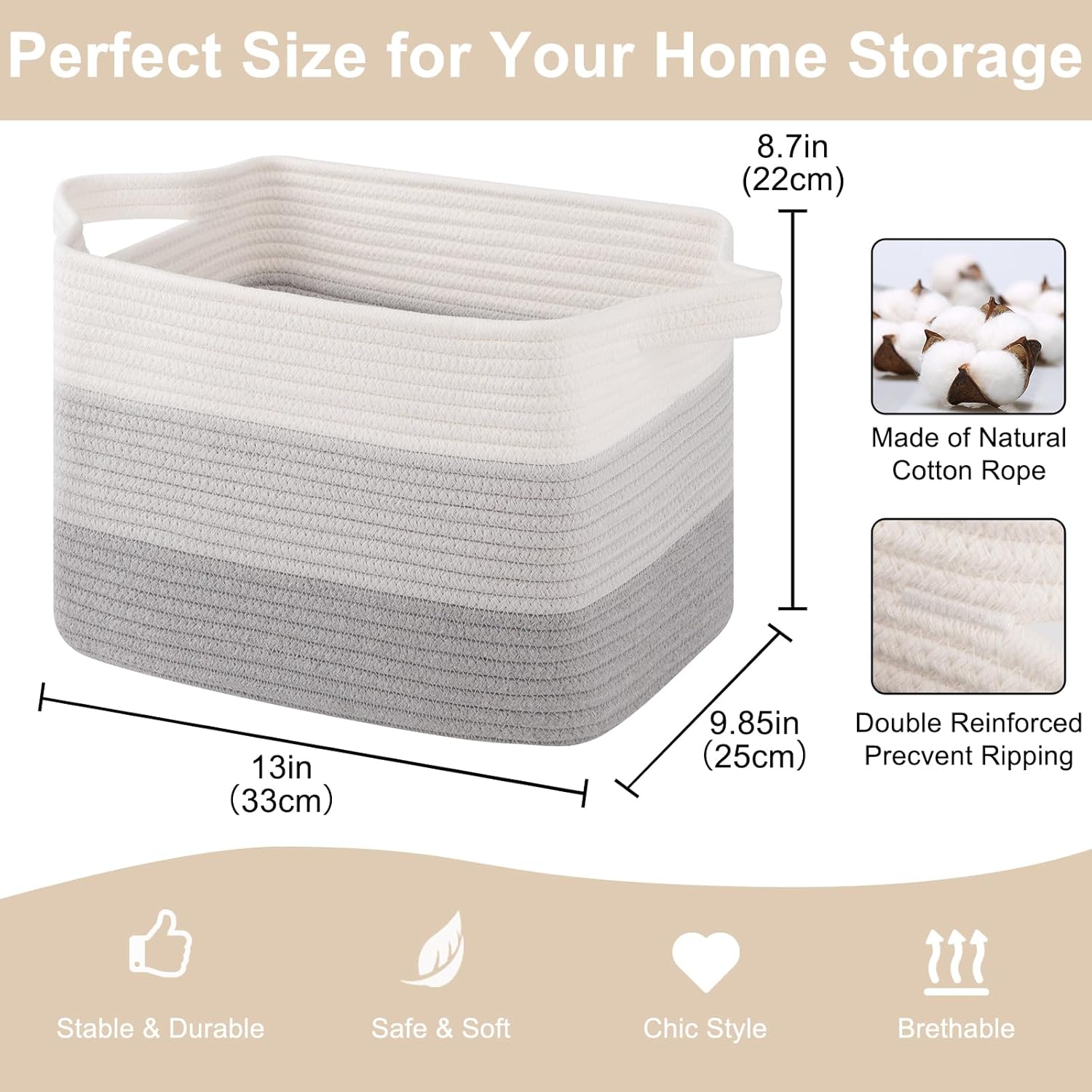 • Soft and Durable: Our shelf baskets are meticulously handcrafted from high-quality natural cotton rope that's ultra-soft and durable. No odor or sharp corners, making it safe for babies, and won't scratch your furniture and floor. Ideal for nurseries and playrooms