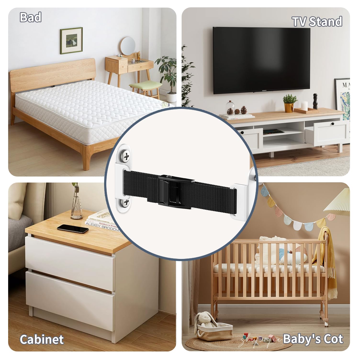 • 2. Easy to Install: This baby-proof furniture anchor is easy to install: fasten one end to the back of the furniture and the other to the wall, with the whole process taking just a few minutes. It is equipped with an adjustable hardware buckle; when you need to move the furniture or clean the back of it, simply press the buckle’s switch to easily release the anchor.