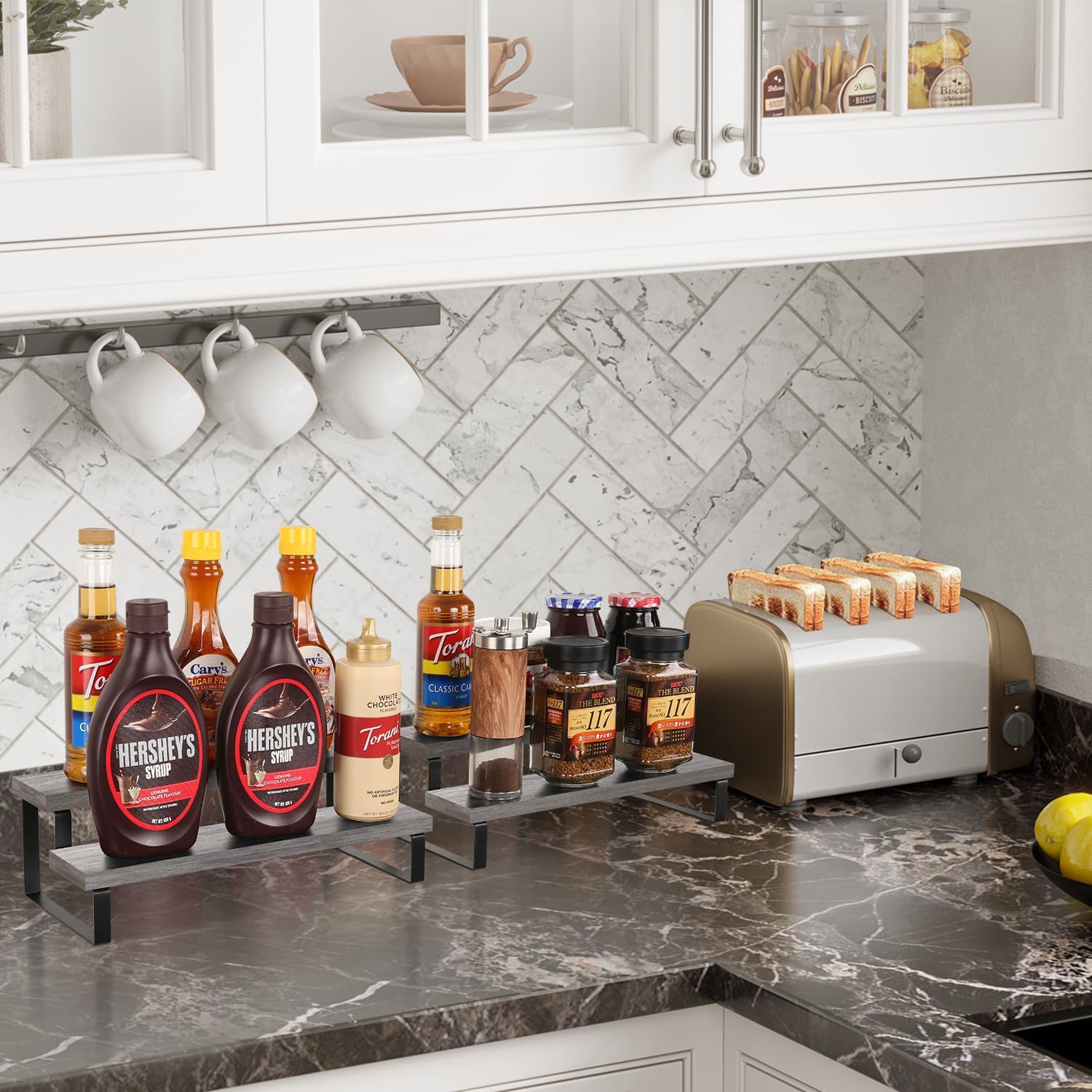 YINMIT Wooden Display Riser Stand, Tiered Perfume and Cologne Organizer Stand, 2 Tier Spice Rack Organizer, Rustic Display Shelf for Candles (2 Tier,2Pack,Grey)