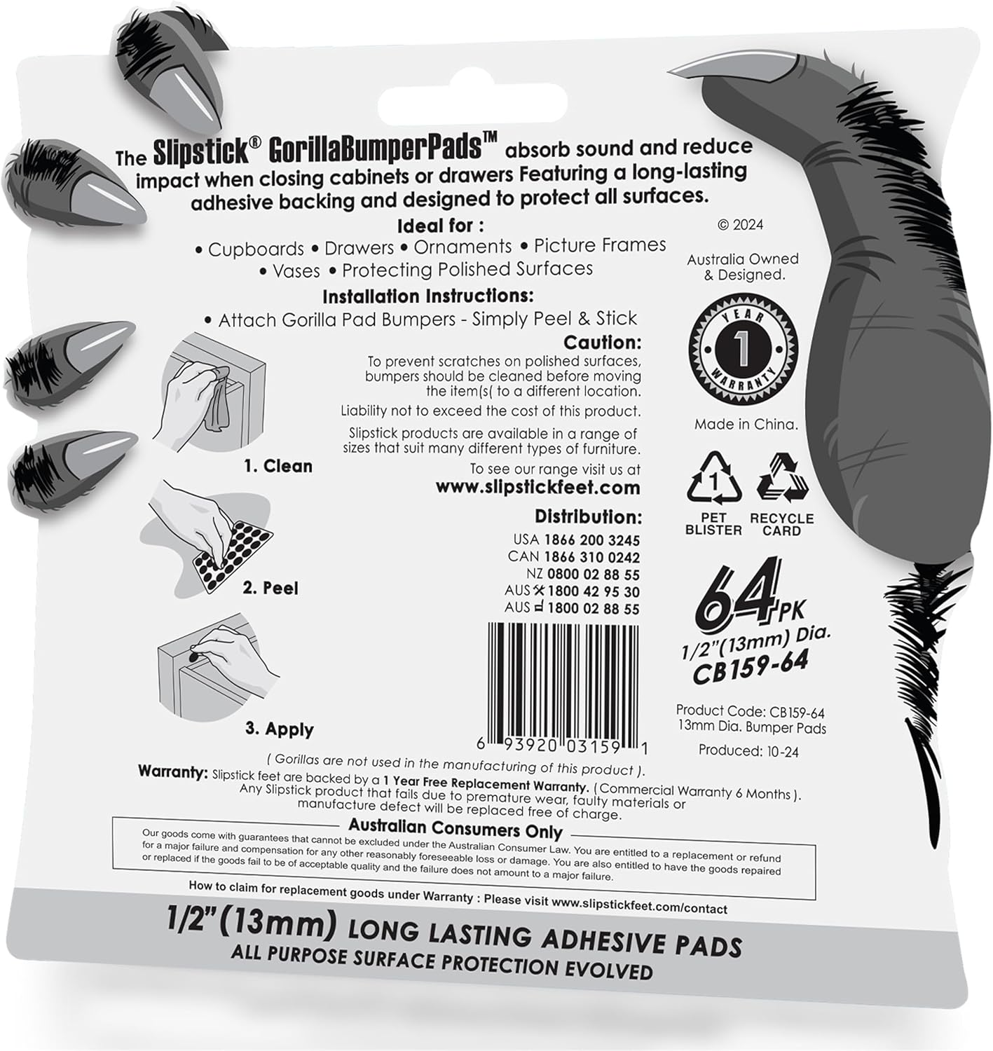 • 64 Premium ½ inch round rubber bumpers – Includes 64 adhesive door bumper pads that are ½”(13mm) diameter x 1/8” (3mm) thick. Gorillapad drawer and cabinet stoppers are made from special formulated rubber foam for lasting protection, feature extra sticky backings for a quick and easy stick on attachment, and are covered by a 1-year free replacement warranty should product fail due to premature wear.