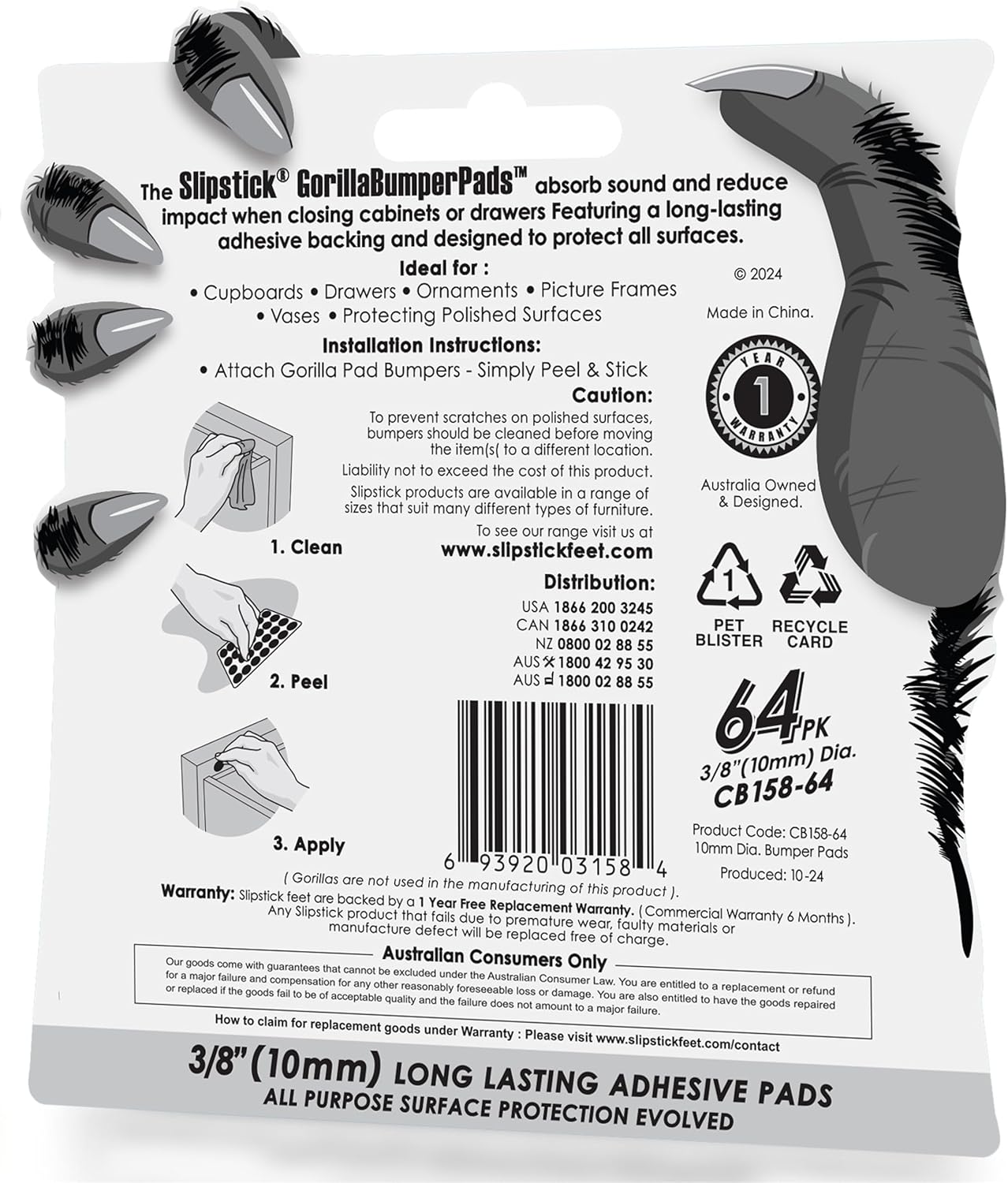 Slipstick GorillaBumperPads Premium Cabinet Door Bumpers 3/8” Round Non Slip Pads, Cabinet Stoppers, Bumpers for Drawers, Cupboards, Cutting Boards, Glass Tops, Picture Frames, 64 Gripper Dots
