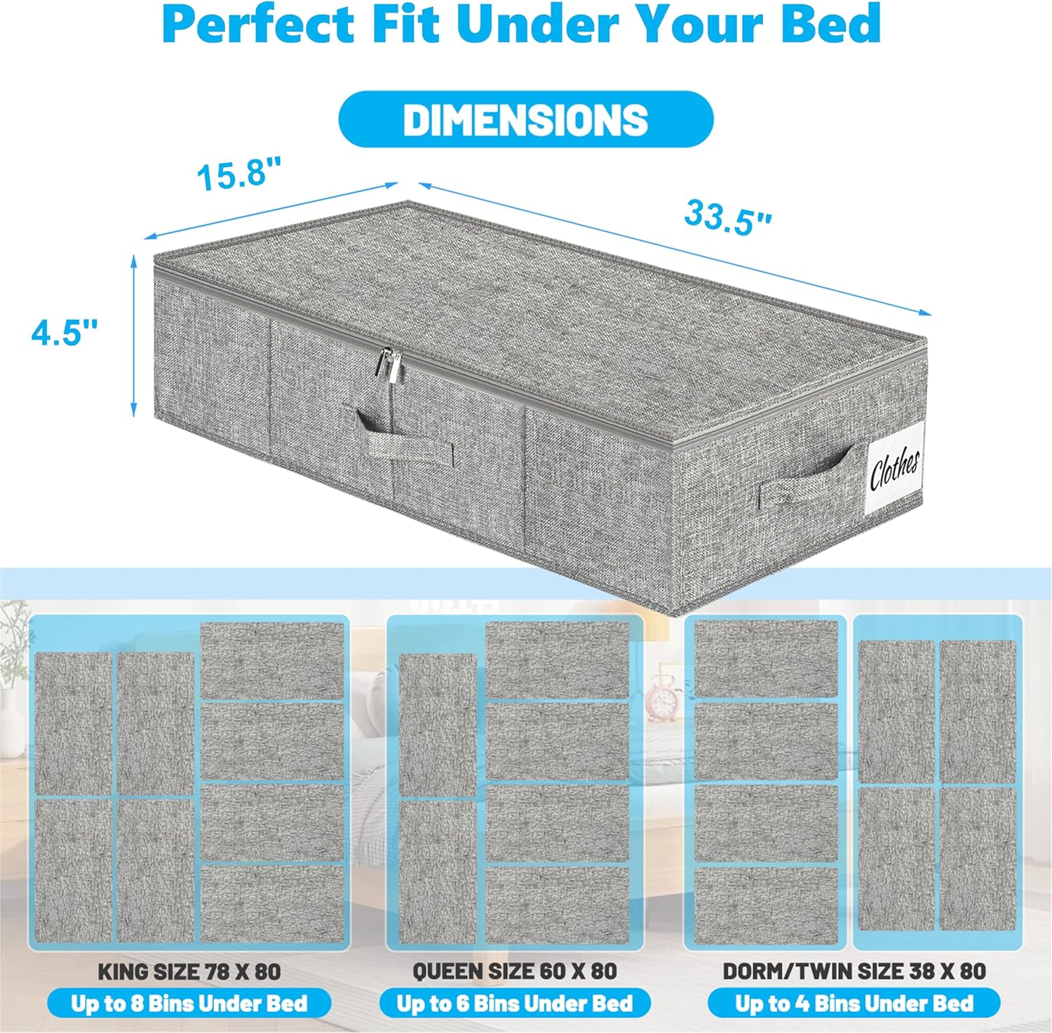 • LOW PROFILE UNDER 5 INCHES but Ample Capacity: Measuring 33.5" x 15.8" x 4.5", these under bed storage containers of the Slim series can fit effortlessly under most beds and sofas, while providing ample space for clothes, comforter, bedding, shoes, toys and blanket storage. Their low profile makes them a versatile solution for closet organizers and storage, especially in dorms and apartments where space is tight.