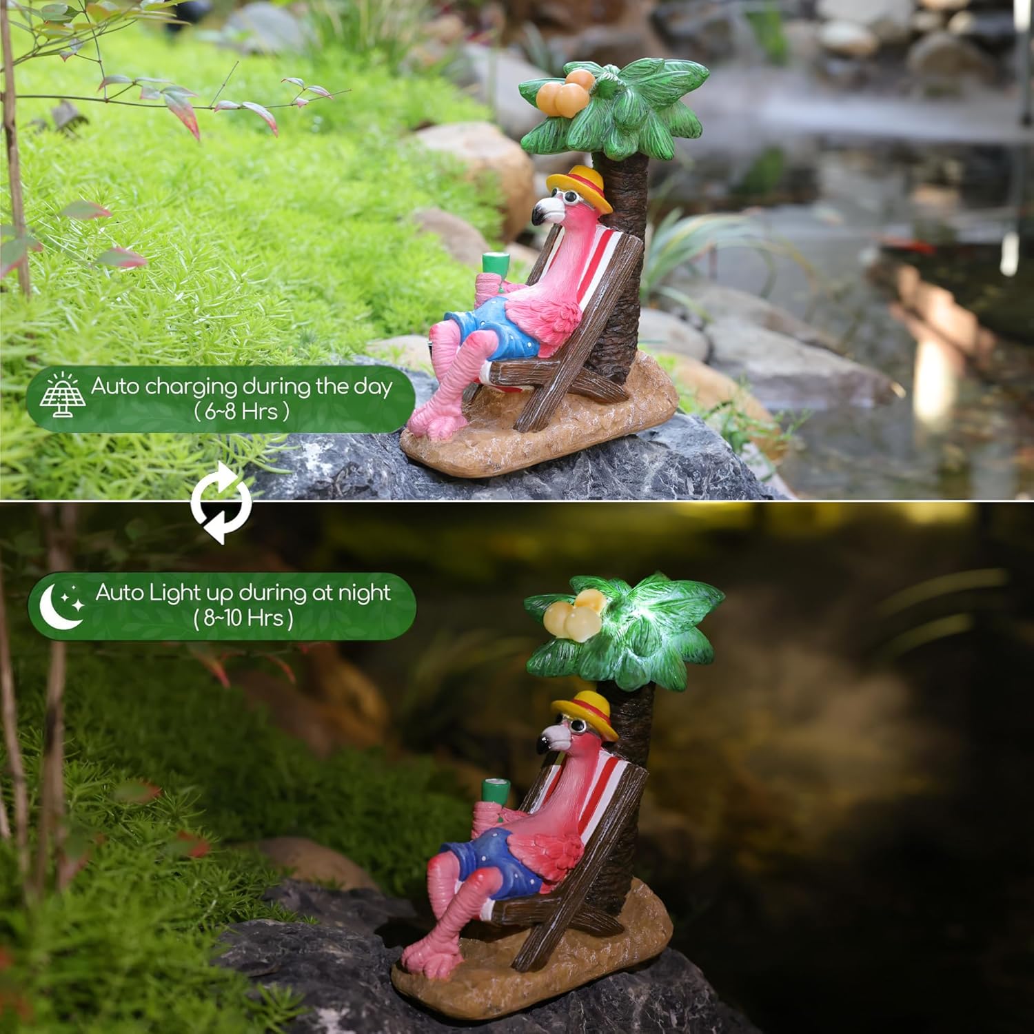 • 【HIGH QUALITY & HAND-PAINTED】This flamingo solar lights is hand made by durable long-lasting resin, highly-detailed and waterproof outside decorations for yard. tiki decor measures 8.6”Wx4.2”Dx9.5H