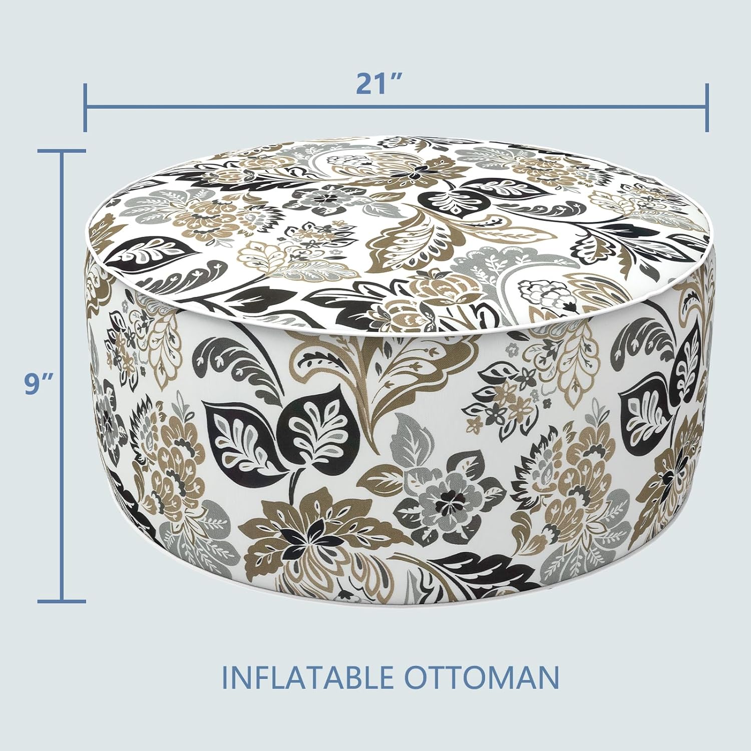 • PACKAGE INCLUDING: FOOT PUMP IS NOT INCLUDED. This value bundle come with 1 pcs indoor outdoor inflatable ottoman measures D21” x H9” (53 x 23cm). Made of durable and soft polyester fabric, sturdy inflatable PVC liners.