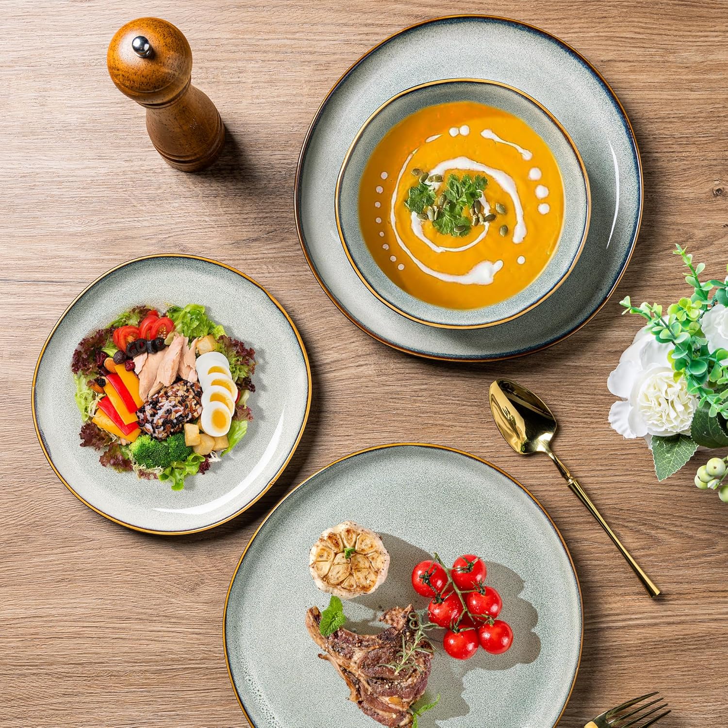 • EVERY PLATE IS UNIQUE: This dinerware set are fired with two different glazes, so the surface develops a beautiful color and makes your food looked even more delicious. The reactive glaze makes every plate unique. Since our glaze is all-natural, it tends to change color depending on the lighting. The color may be a tad different from what you see on your screen, but every item is beautiful. Our glaze is also extra strong to prevent scratches from your knives and forks.