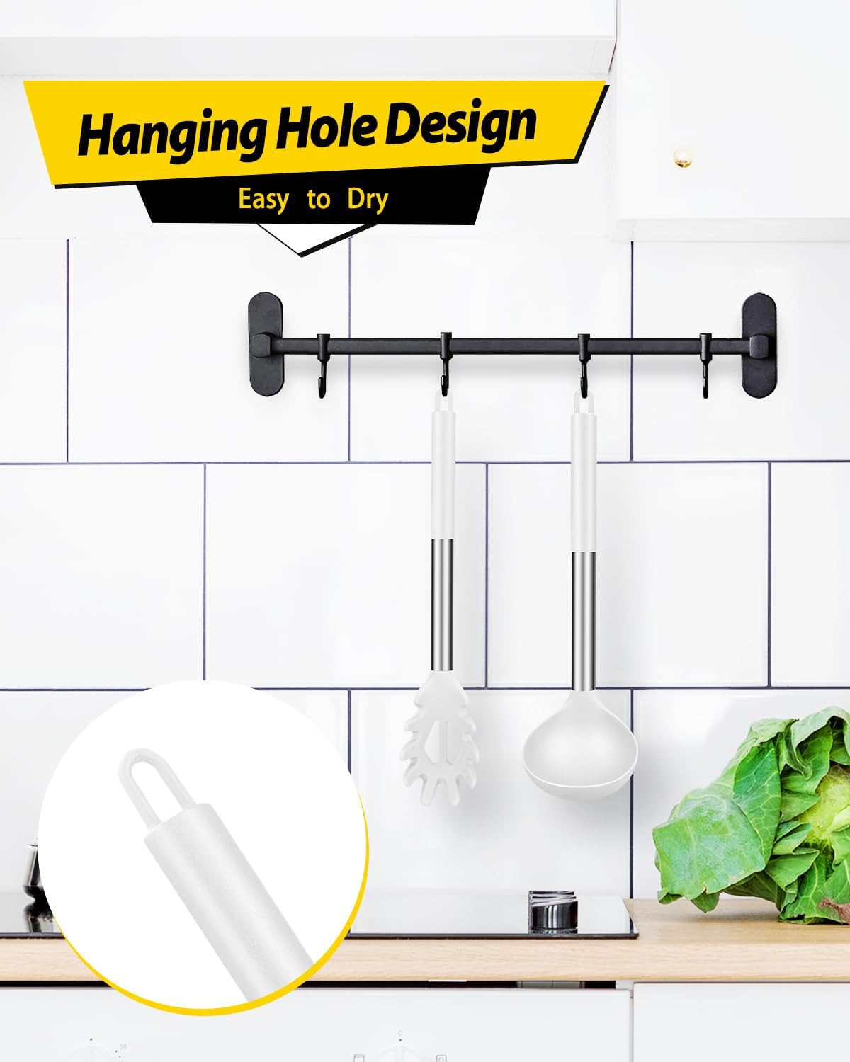 Silicone Pasta Fork and Ladle Spoon Set, Large Non Stick Kitchen Utensils for Cooking,Stirring,Serving Spaghetti, Soup, Sauce (WHITE)