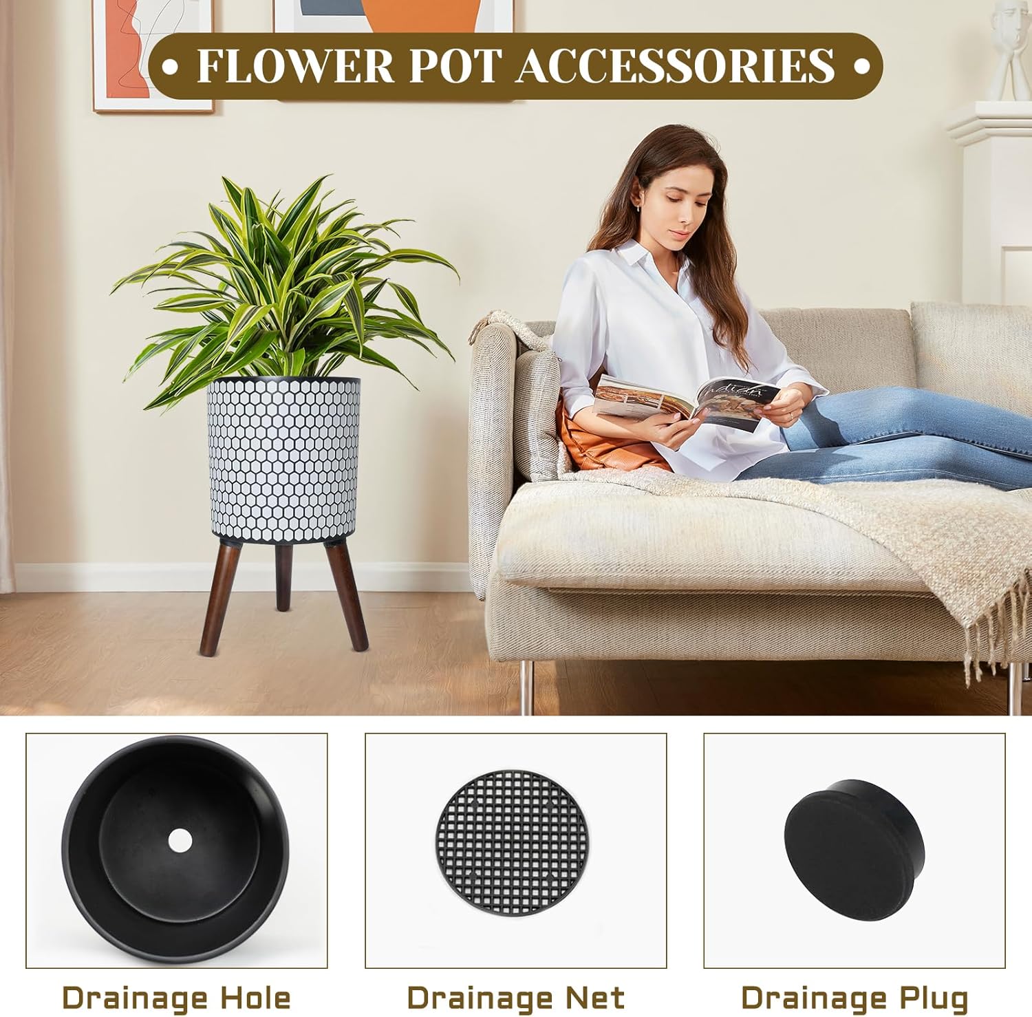• 【Why Choose A Flower Pot With A Stand? 】This standing plant pot features a 3D honeycomb texture on its surface, seamlessly integrating the natural beehive structure into interior decor. The raised wooden legs raise the flower pot, creating an elegant and orderly atmosphere in the room.
