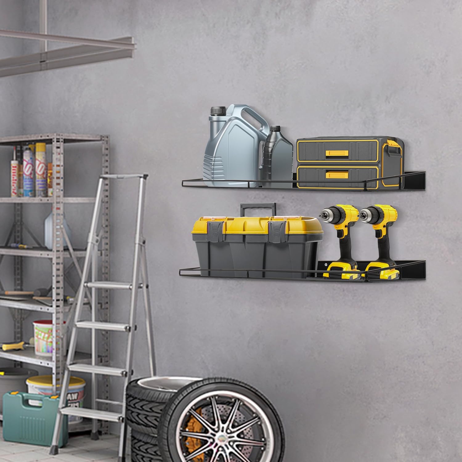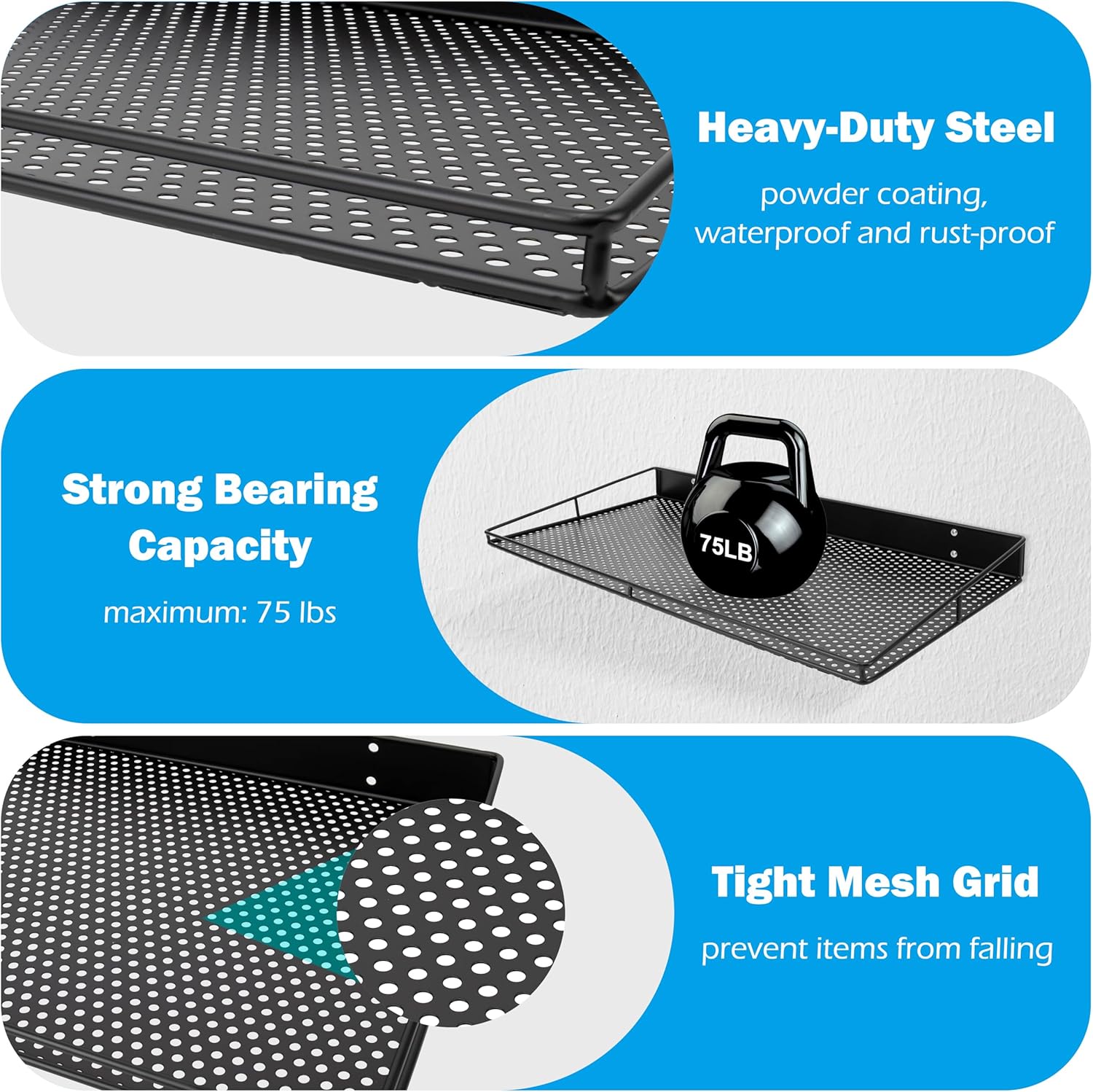 • Space Saving: The wall mounted shelves make full use of wall space to improve space utilization. Free up the floor area and bring order to a cluttered garage. The maximum load capacity can reach 75 lbs to fully meet the needs of daily use.
