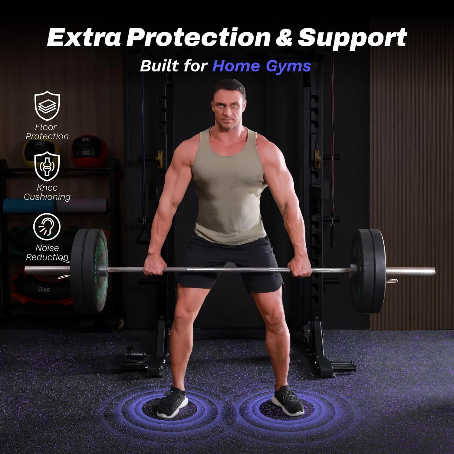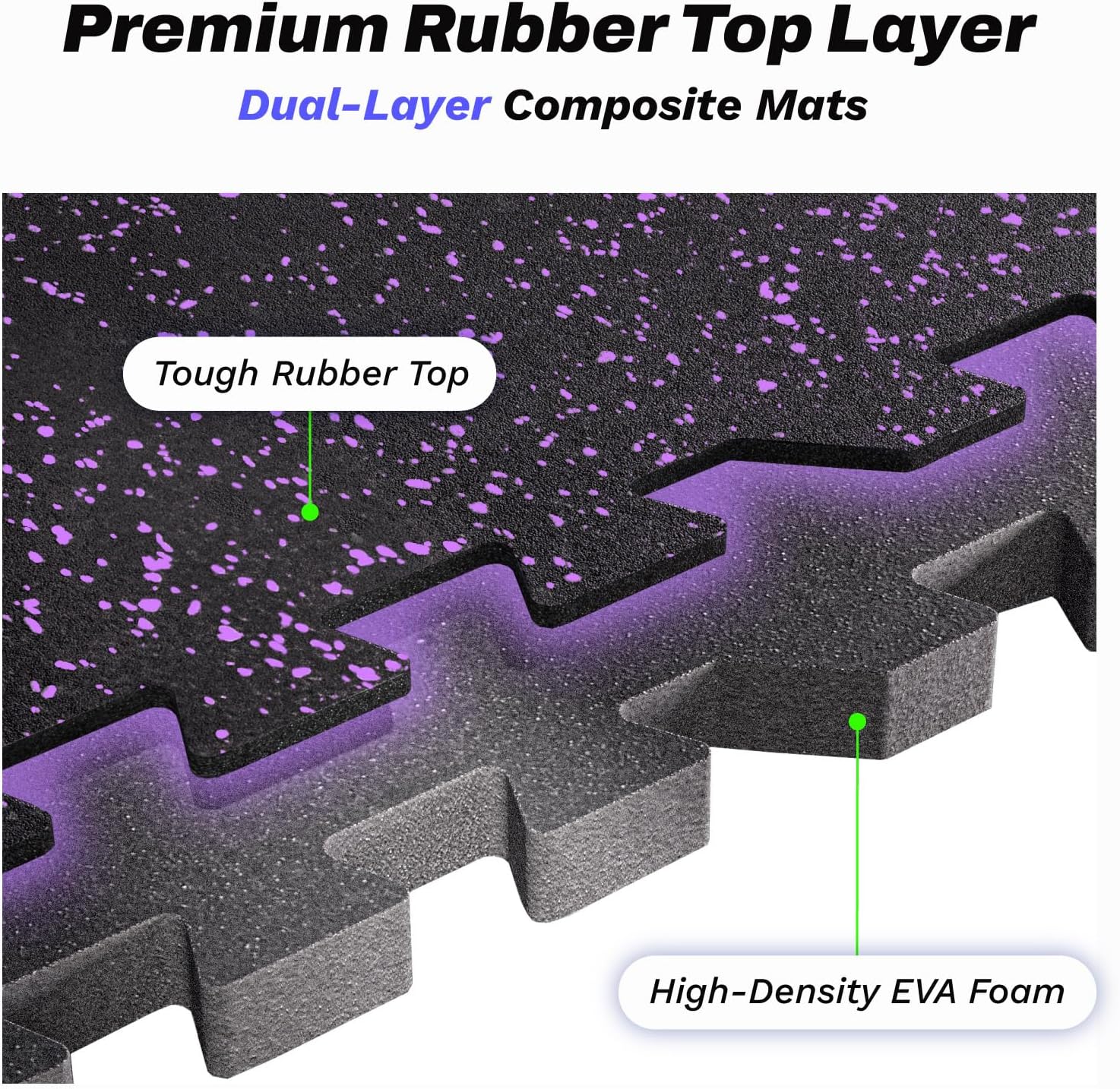 • [Upgraded Dual-Layer Design]: Concerned about your equipment scratching the floor during workouts? Our 2in1 Rubber Top EVA Foam Exercise Gym Mats are crafted to solve this issue. The textured rubber top layer, combined with a high-density EVA foam bottom layer, seamlessly creates a non-slip tough surface with excellent shock absorption.