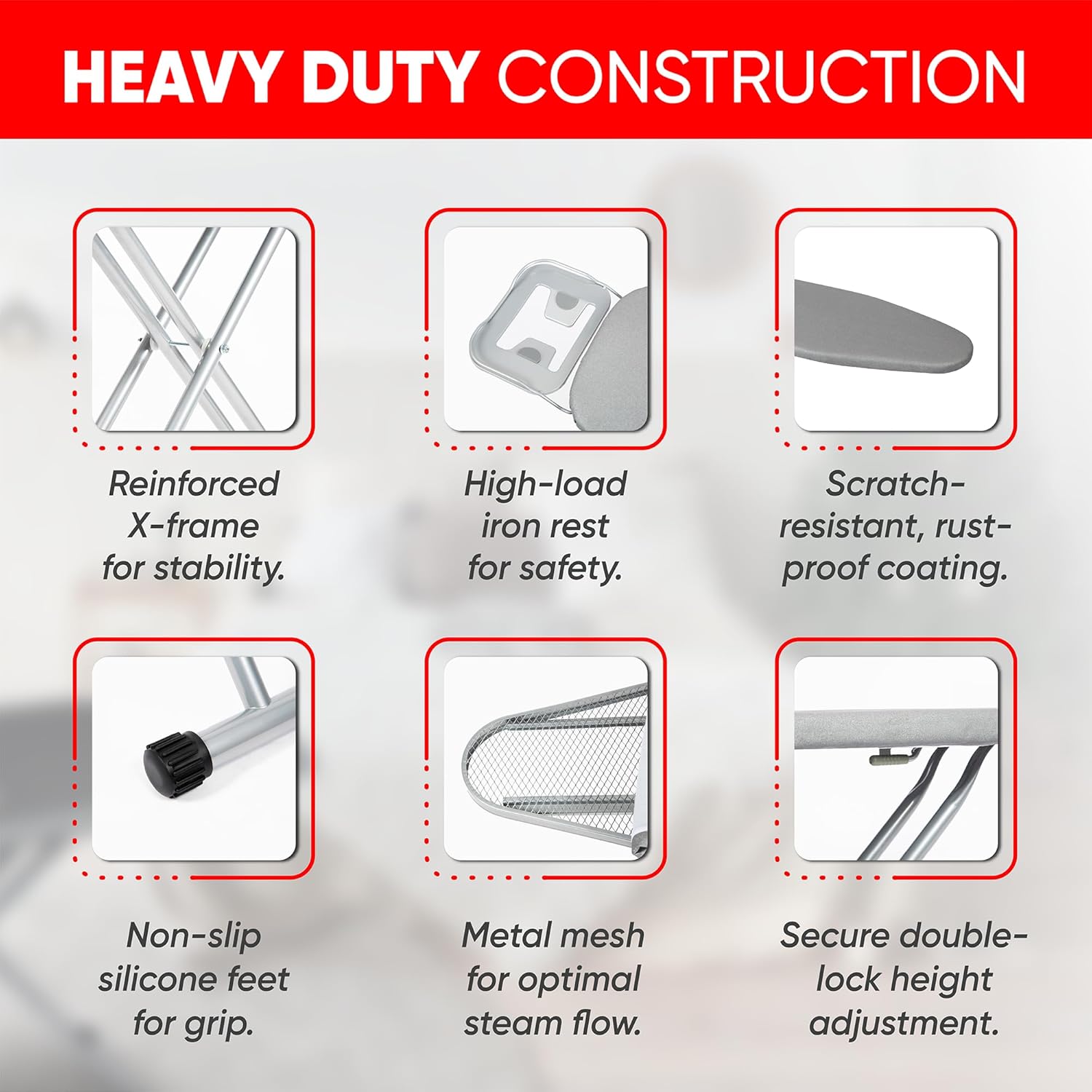 • Durable & Heat-Safe: This heavy-duty ironing board features a heat-resistant cover and a sturdy steel frame, delivering smooth, long-lasting results on any fabric