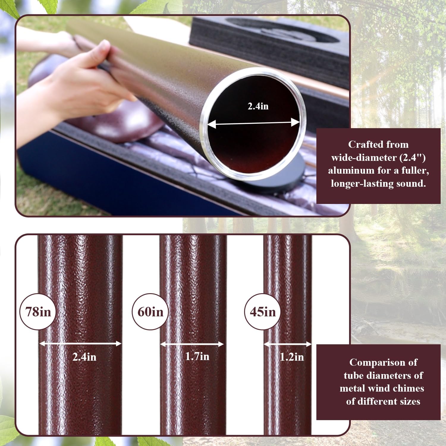 • Metal Wind Chimes - The extra large metal wind chime is made entirely of aluminum ,not only the six tubes,also the hook,the top part and the wind chimes pendulum,all durable anodized bronze finish.Thick tubing wall creates a longer lasting deep tone.Each tube is precision tuned to pentatonic scale.