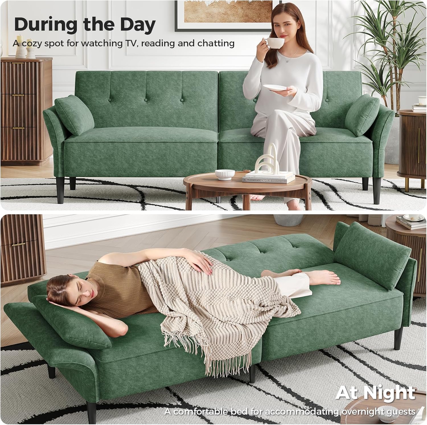 • 【Four-position Adjustable Armrests】Designed in popular styles, this convertible sofa bed is a perfect blend of style and durability. The armrests on both sides can be deployed outward for maximum side lying area, and the maximum deployment angle can be up to 90°. Meanwhile, with the two soft report pillows provided, you can place the pillows at the cervical vertebrae and lumbar region to effectively relieve fatigue