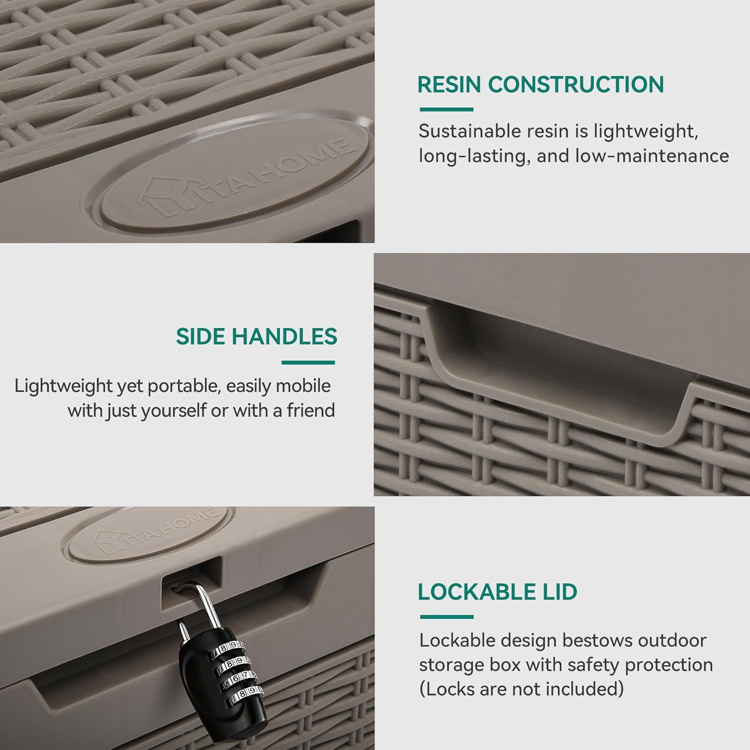 • DESIGNED FOR CONVENIENCE- Our deck box has built-in handles on both sides for convenient lifting and movement; Add a combination lock/padlock (not included) to the top lid to offer extra security
