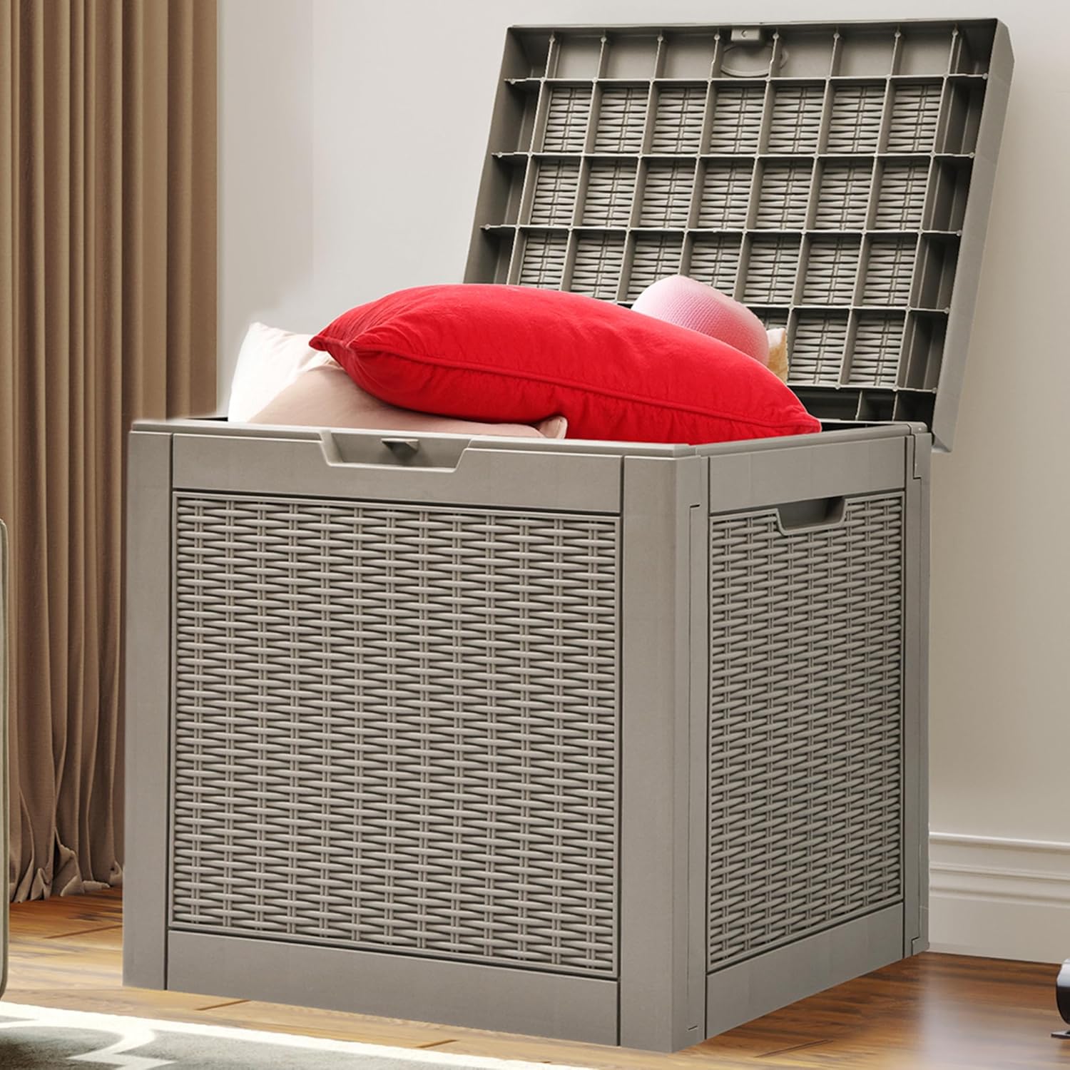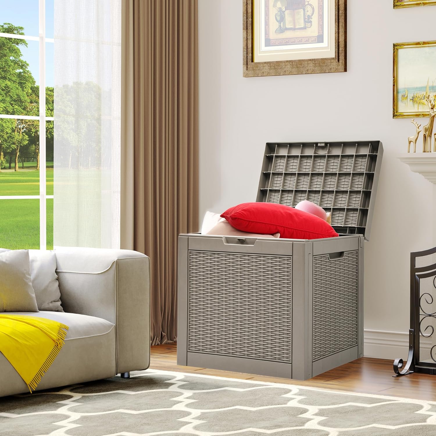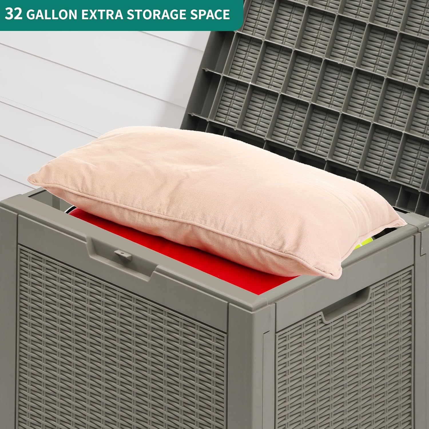 • VERSATILE APPLICATION- This deck box has a 32-gallon capacity that provides ample room for daily indoor and outdoor storage of cushions, garden tools, etc.; Can also be used as a side table, patio seating, storage ottoman, or footstool