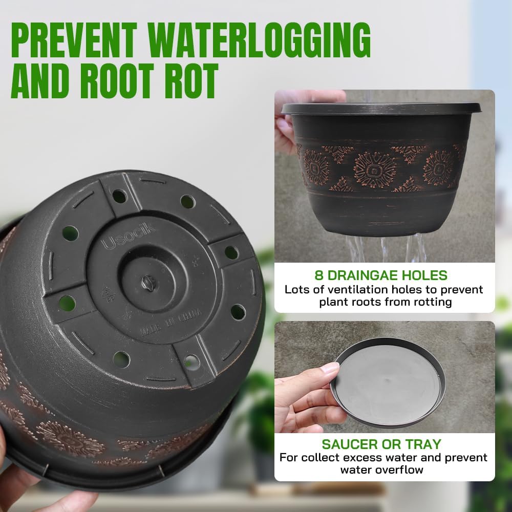 • VINTAGE DESIGN - Vintage colors and a classic look with special flower design. These plastic indoor plant pots are whether resistant and will not color-fade or crack over time.