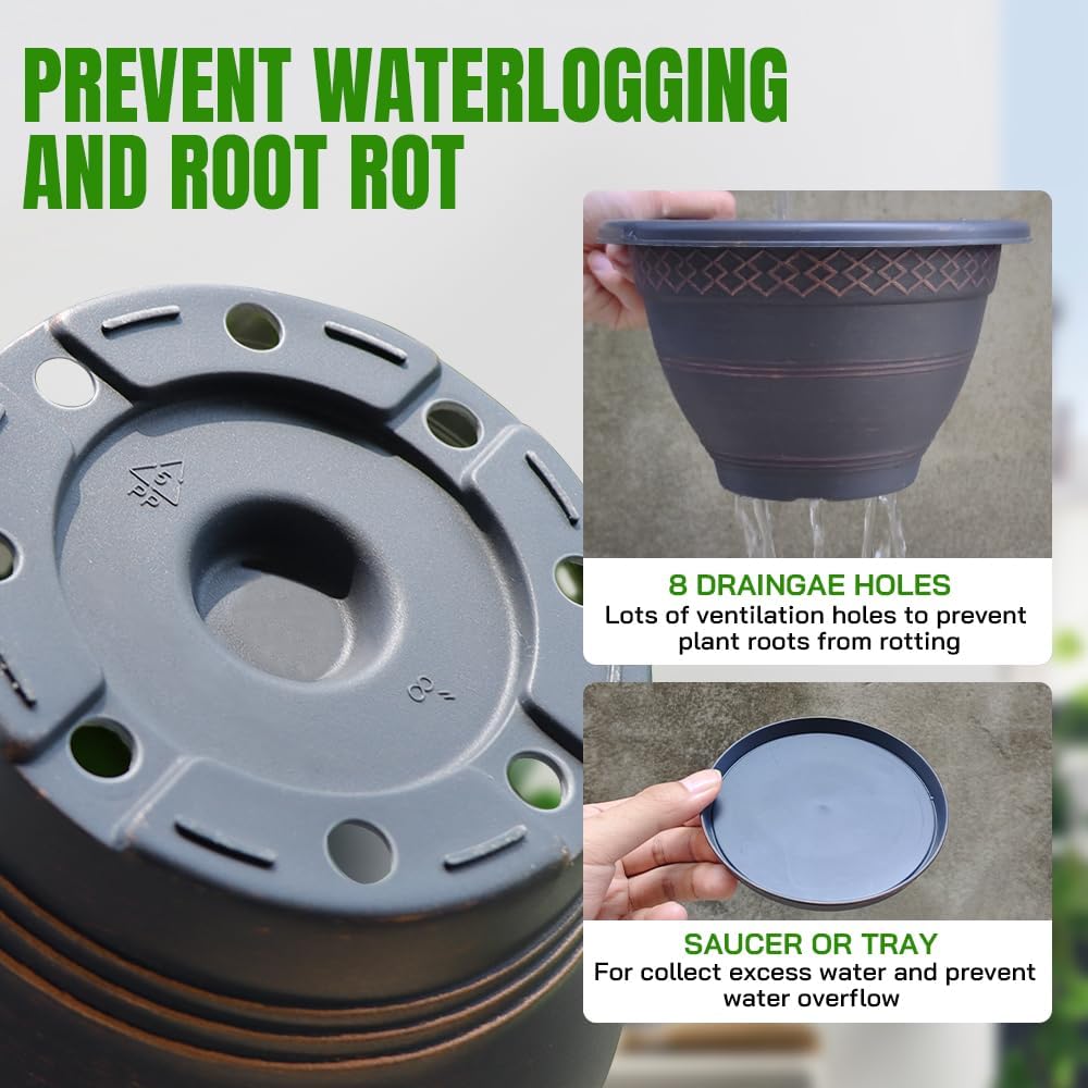 • Drainage Hole and Saucer - There are 8 drainage holes at the bottom of our garden pots, which can control excess water, increase the breath ability and benefit the growth of plants; the lightweight saucer can not only collect excess water,but also keep your floor or desktop clean.