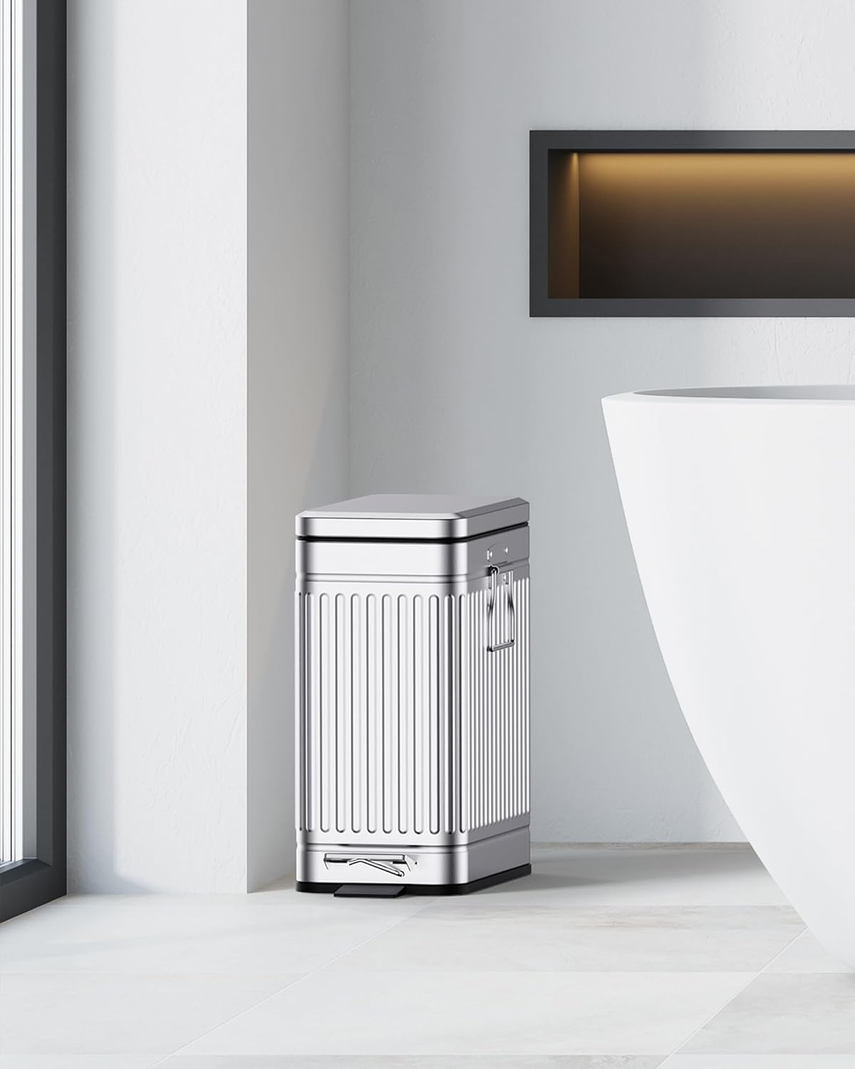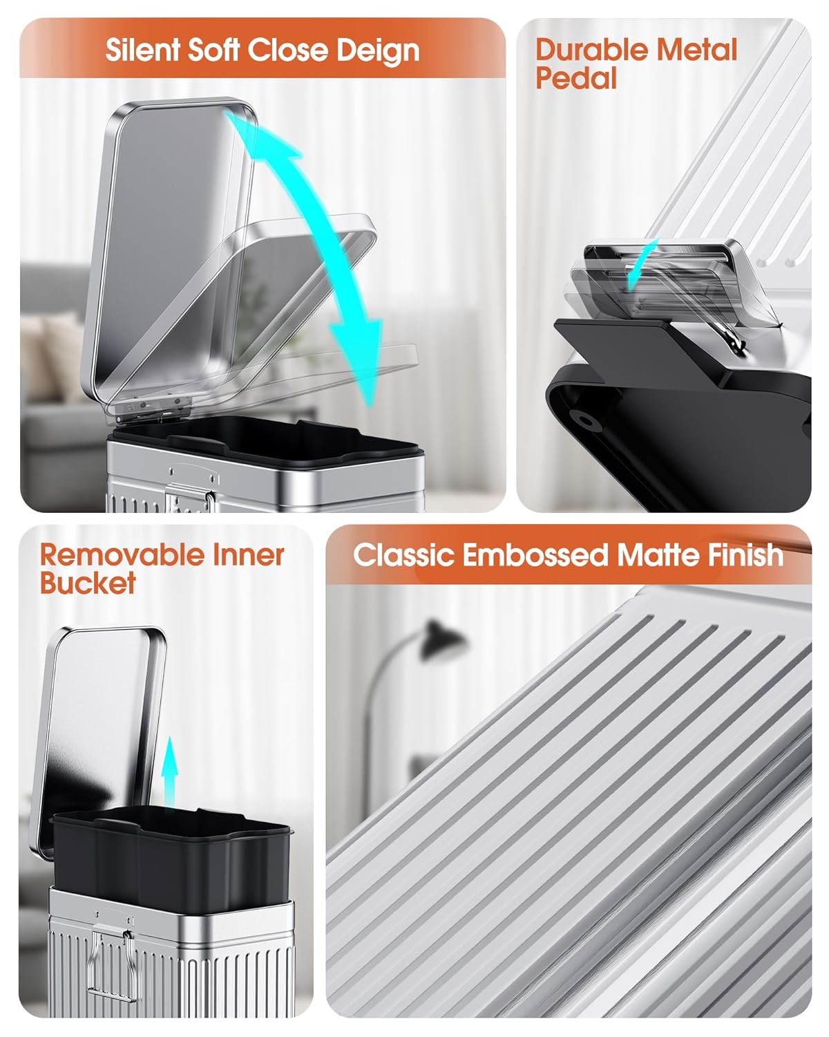 • High Quality: The trash cans are made from stainless steel, rust and fingerprint-proof; The matte embossed finish results in a stylish and modern design for bathroom, bedroom, office, toilet, dorm
