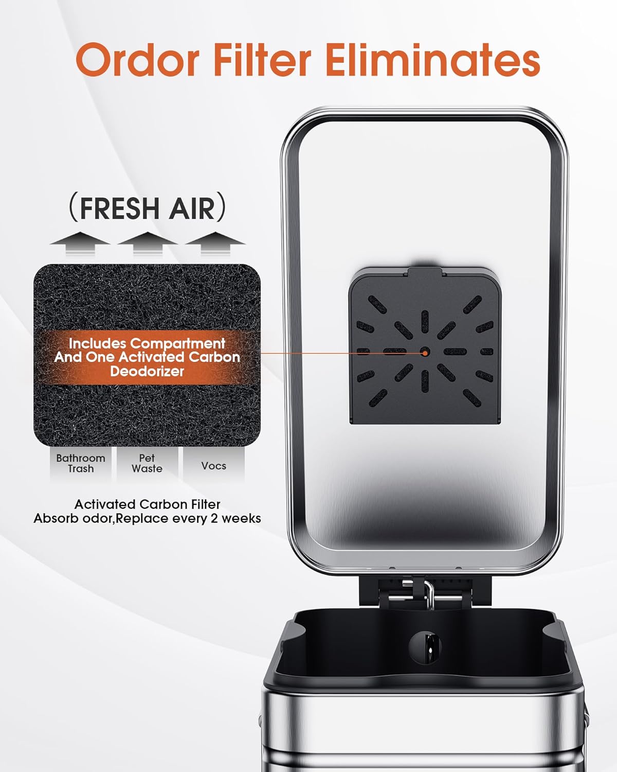 • Odor-Free: The Odor Control trash can included compartment and activated carbon deodorizer absorbs waste odors, 360° sealed space prevents odors from escaping from the can, making your space cleaner