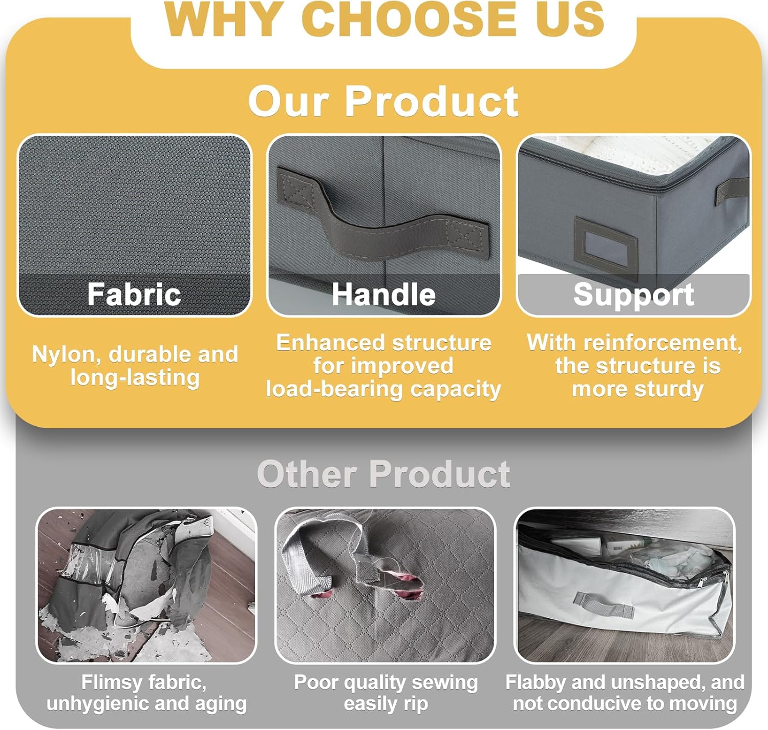 • STURDY AND DURABLE: Our under-bed storage container is incredibly durable. It is primarily made of robust Oxford fabric and reinforced with a thickened PVC film, offering double protection for long-lasting use. The double-stitched PU leather handles and the high-quality stainless steel zipper both contribute to its excellent durability. With thickened cardboard inserted into the sides and bottom, it maintain its shape even when partially filled, keeping your space neat and tidy