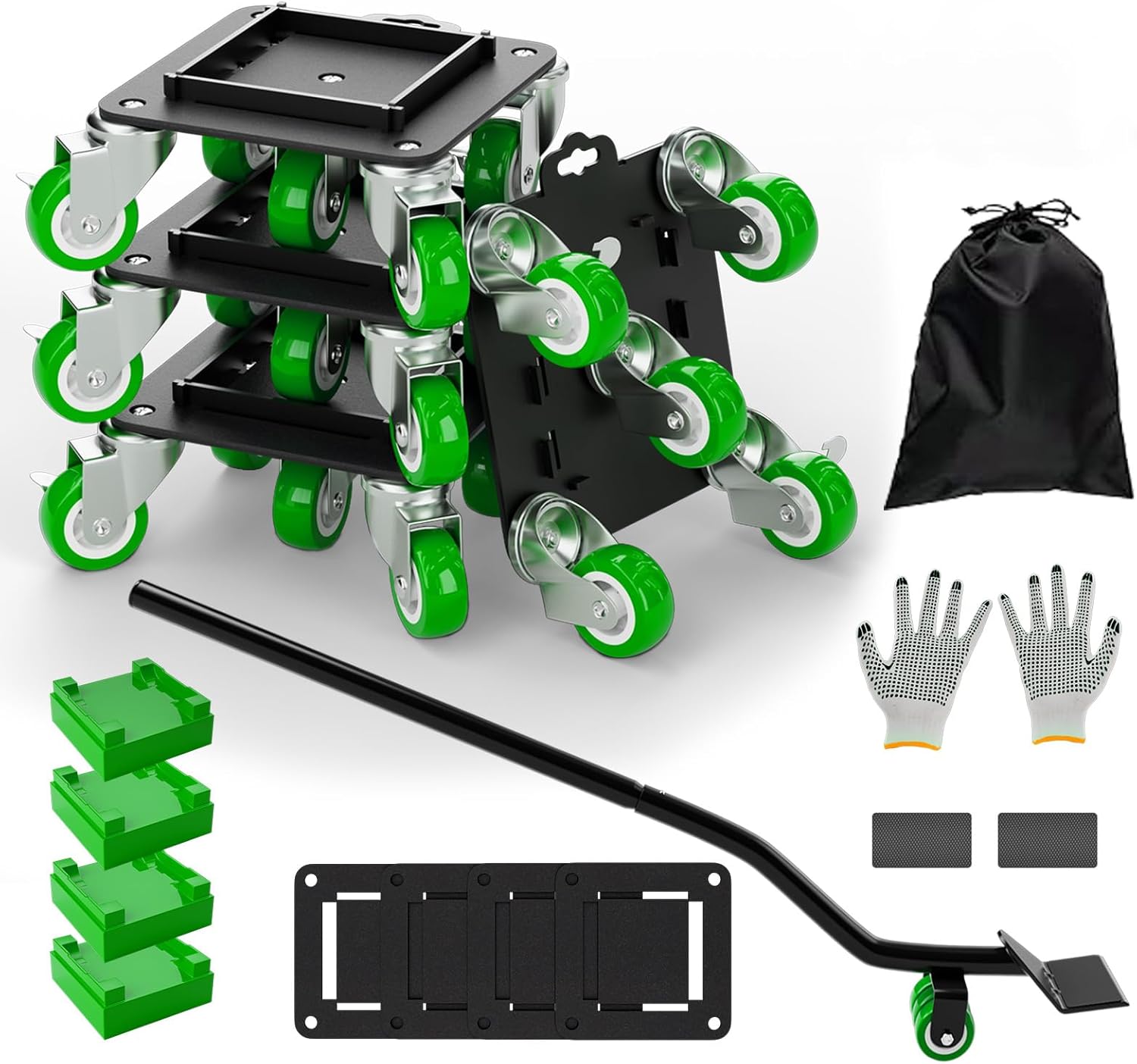 • Complete Furniture Lifter Tool: This set includes four 6.33"x6.33" dollies, 4 anti-skid pads, 16 removable side guards, 1 elastic cord, 1 crowbar, 2 anti-skid crowbar pads, 4 height-raising blocks, 1 pair of gloves, and 1 canvas bag—everything you need for efficient and safe moving.