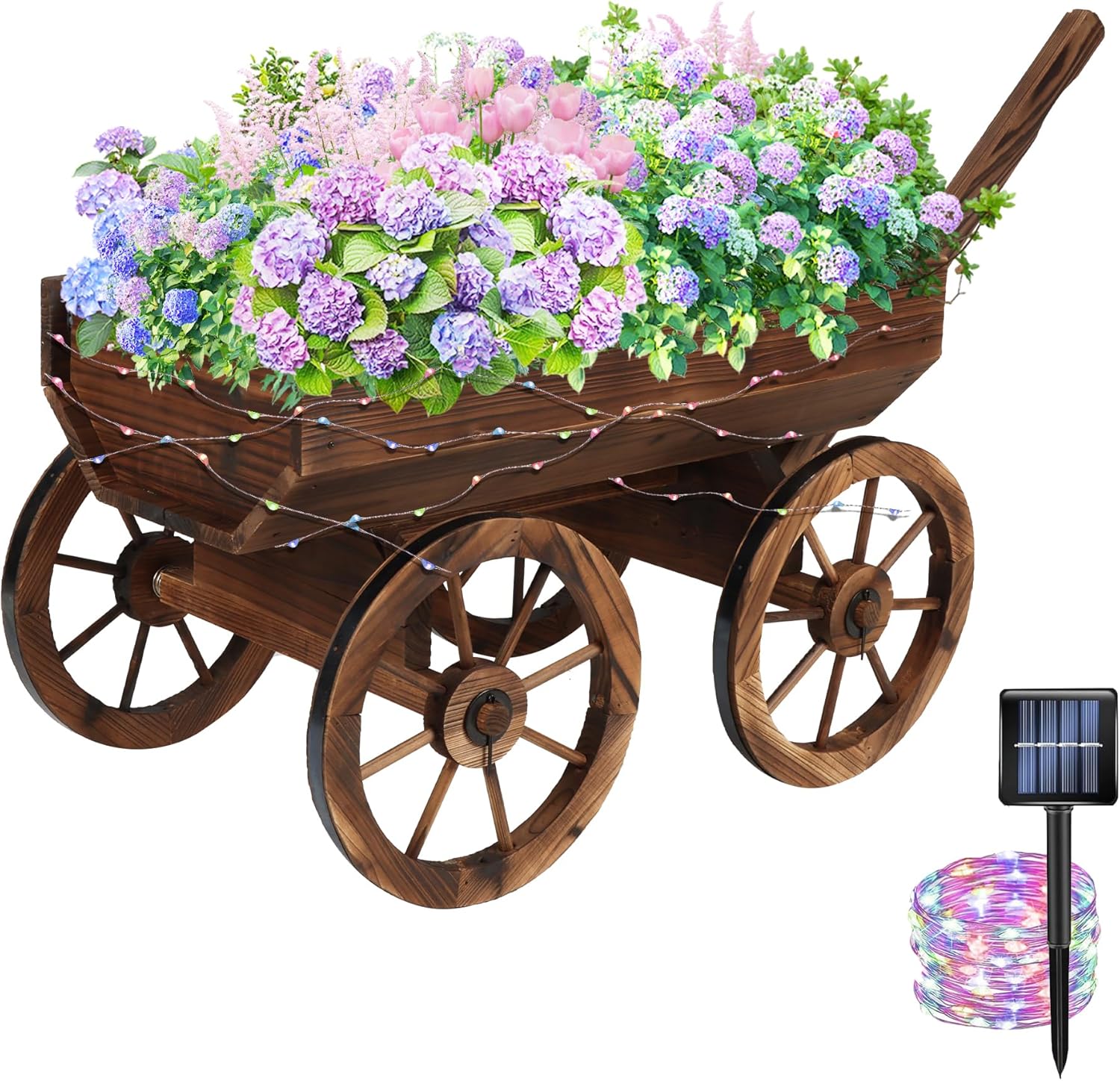Garden Wooden Decor Rustic Flower Pot,Planters Wagon Indoor Outdoor Backyard Balcony Decor,for Outside Garden Decor Wheelbarrow Planter for Patio (Wooden Wagon with Light)