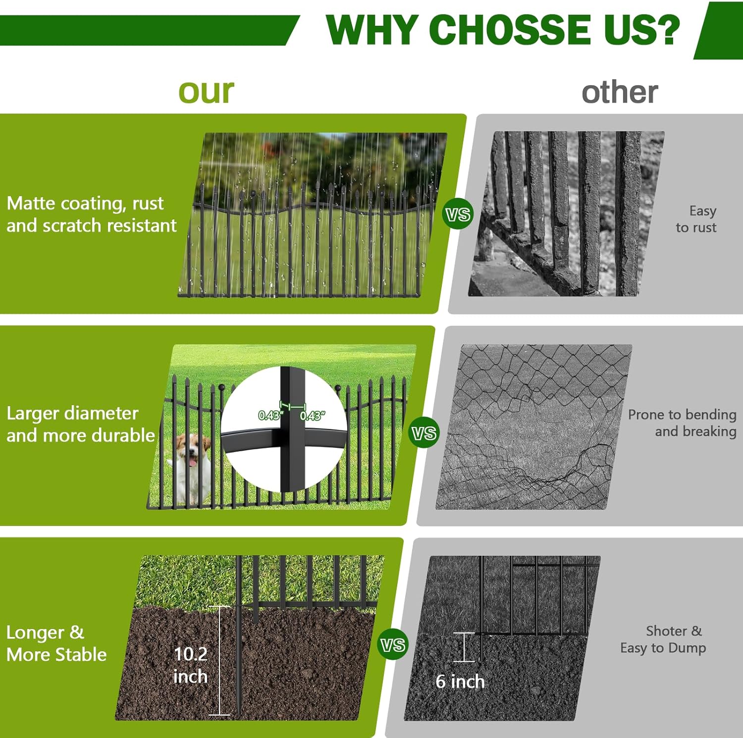 • 【Rustproof & Weather-Resistant】Coated with a corrosion-resistant finish, this fence resists rust, moisture, and harsh weather. The reinforced metal construction stays intact even in extreme conditions, ensuring years of reliable use.