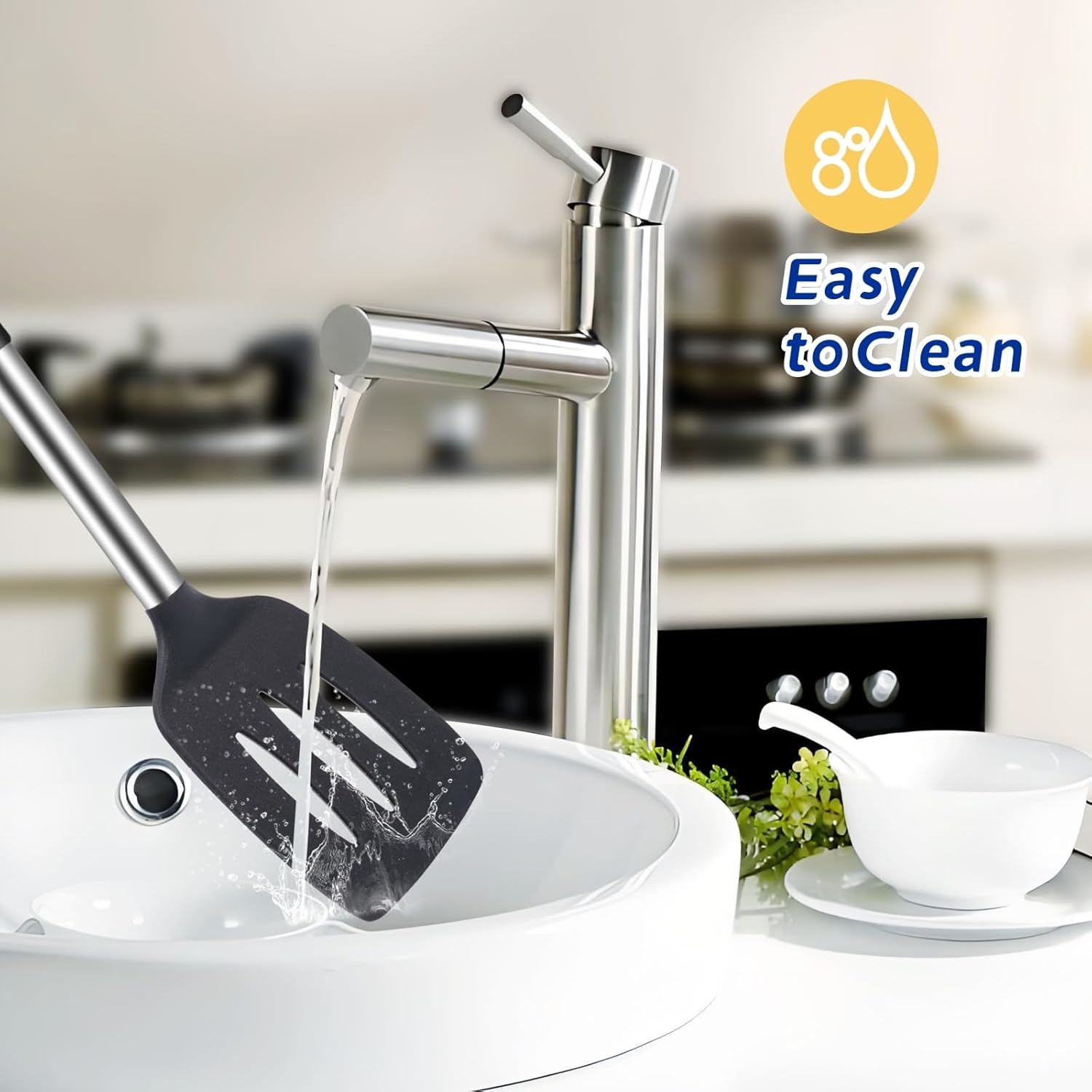 • Easy to clean: Only need to wash the kitchen utensils after use or put them in the dishwasher. Stainless steel handles with a smooth silicone surface that does not oxidize and discolor over time
