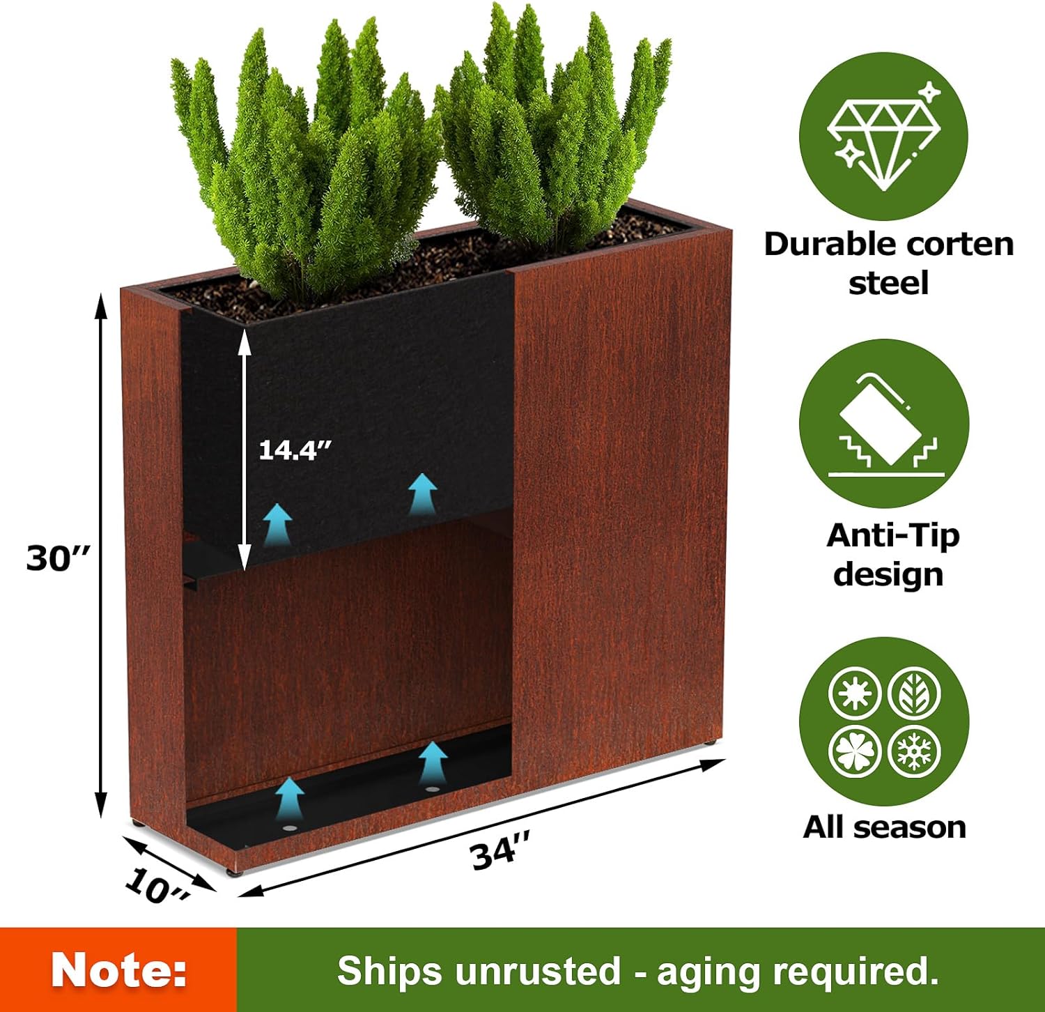 Large Corten Steel Planter Box Outdoor, 30" H x 34" W x 10" D,Tall Rectangular Metal Rusted Planters with Grow Bag,Naturally Rusting Steel Flower Pot,Rustic Décor for Patio,Garden,Deck,Backyard