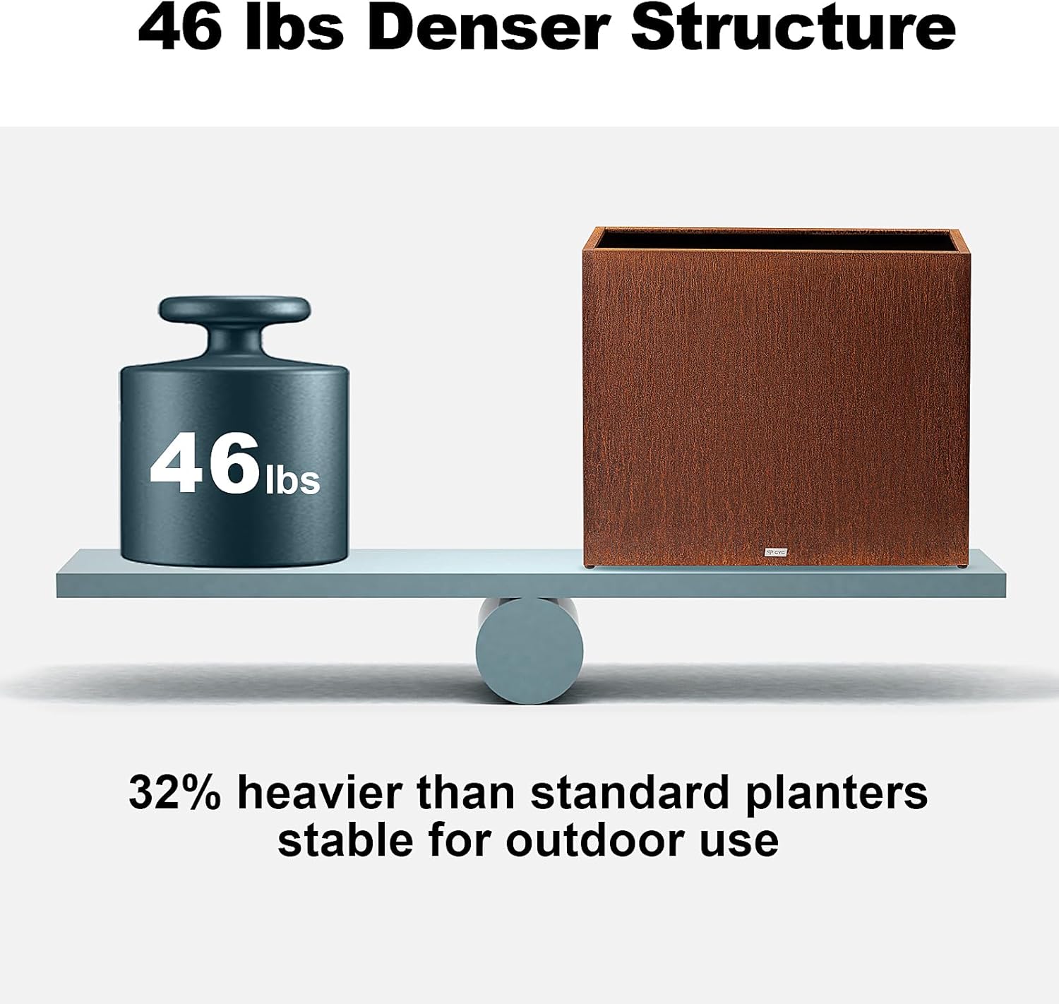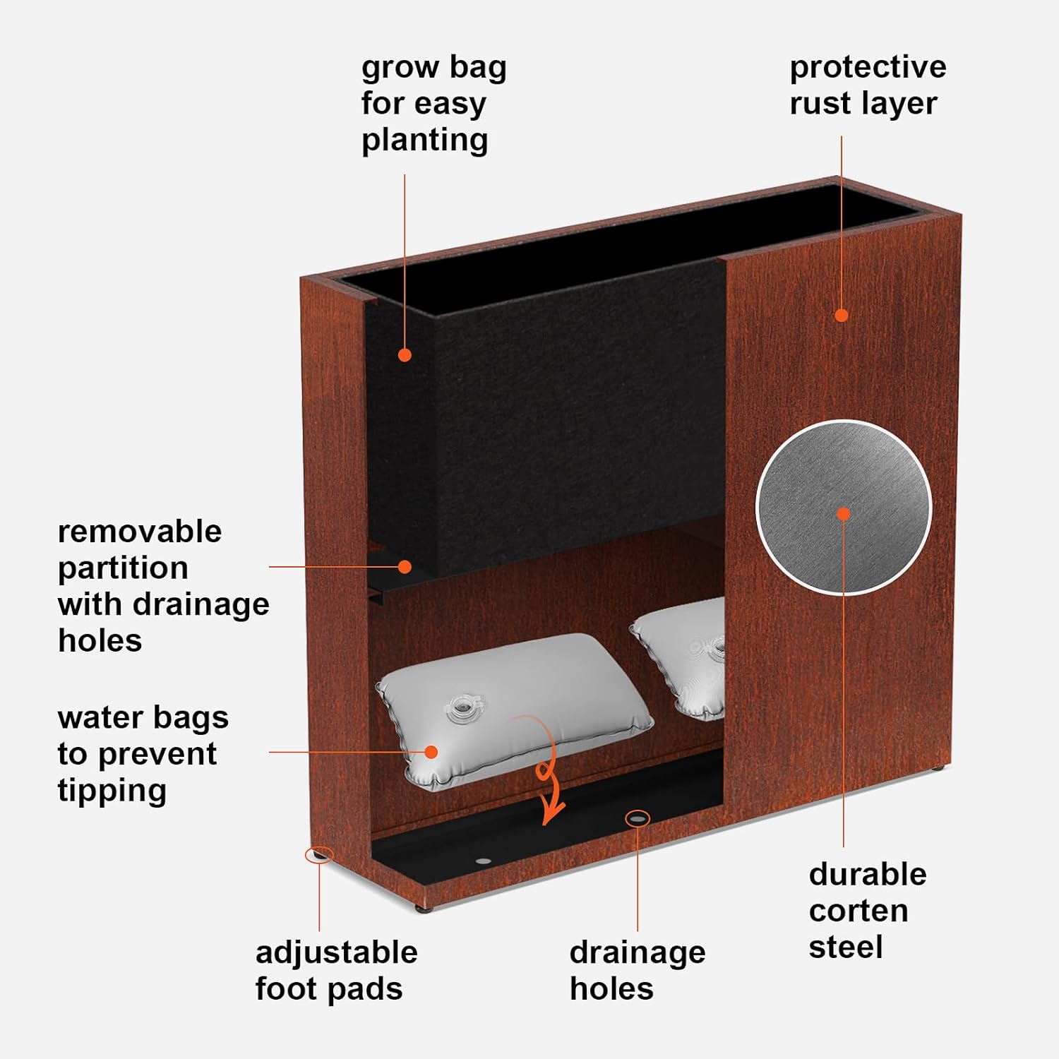 • Anti-Tipping Stability: Our corten steel planter comes with a grow bag for clean and convenient planting and water bags to enhance stability and can withstand a maximum tilting force of 30bf