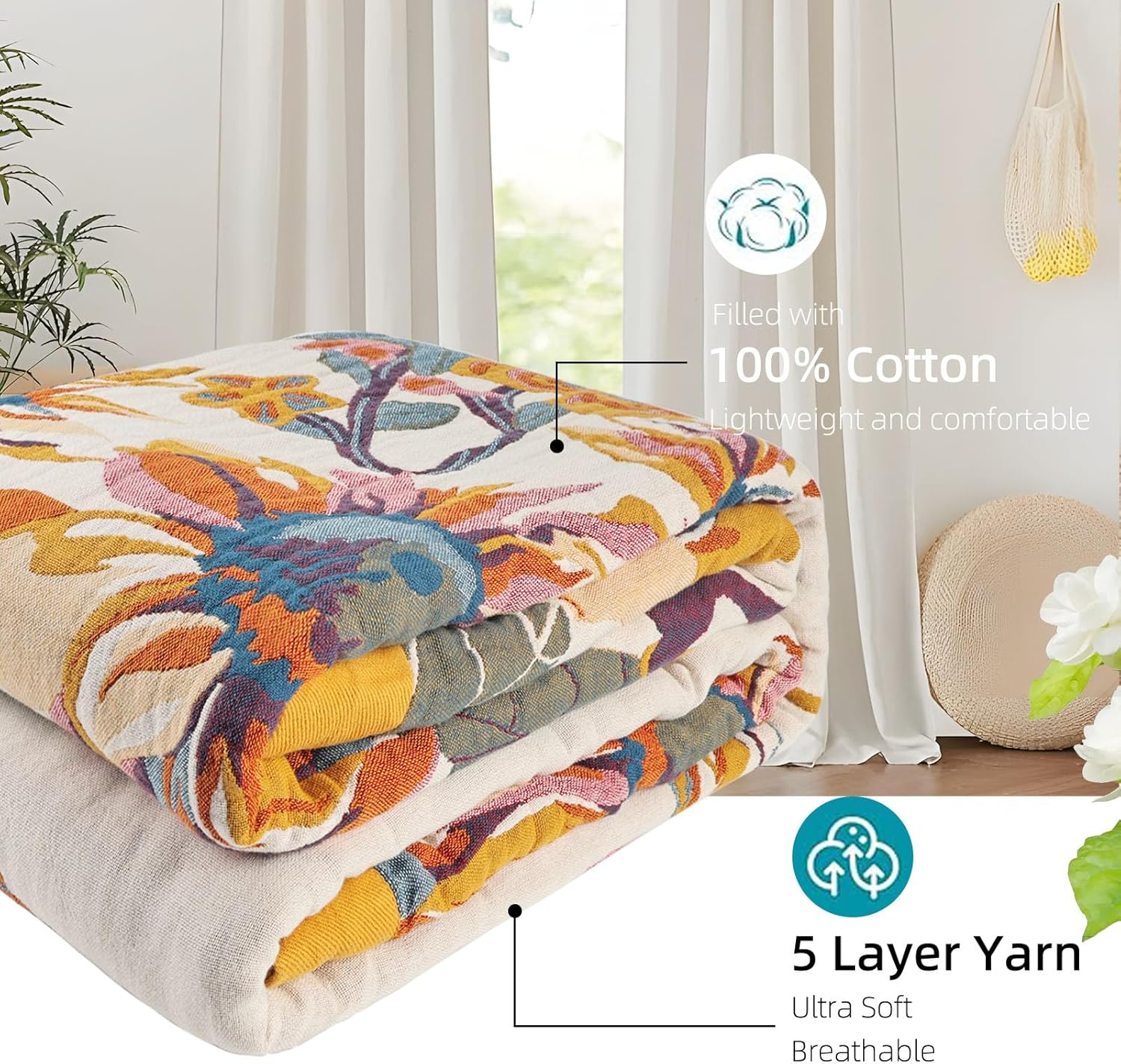 Boho Throw Blanket for Bed - 100% Pure Cotton Ultra Soft Rustic Quilt - Farmhouse Decor Bed Blankets, All Season Rustic Throw for Sofa Couch Chair(60"×80", Floral)