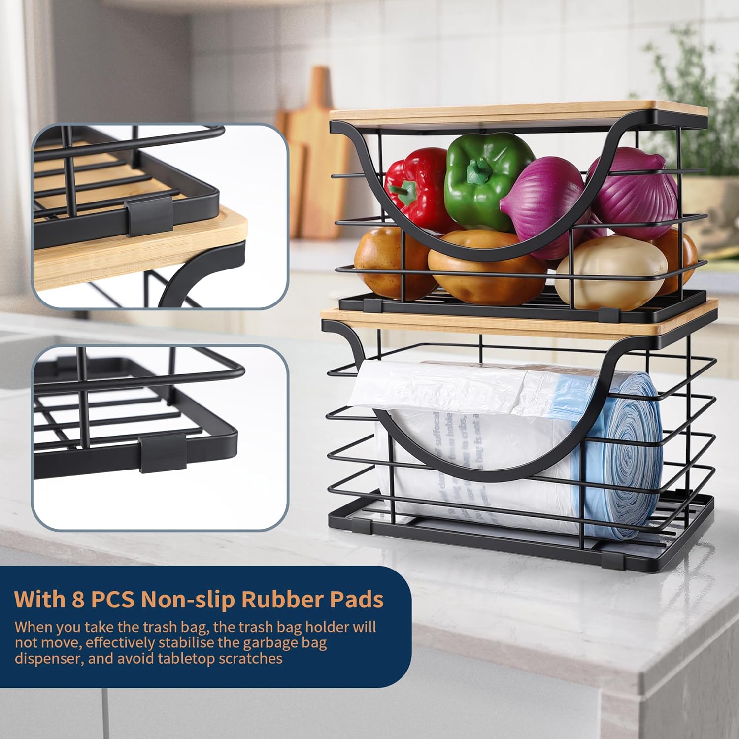 • 2 Ways to Use -stackable wire basket with bamboo top can be used on a tabletop or self-adhesive wall mounted. No need to drill holes, won't damage the wall. Multi-functional Garbage Bag Storage Dispenser is suitable for kitchen, laundry room, toilet, under the sink, cabinet, etc., you can store laundry supplies, cleaning supplies, vegetables and fruits, snacks and so on
