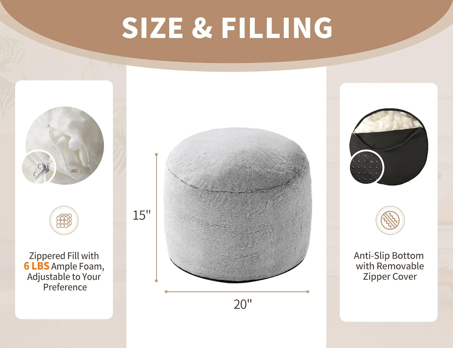 • Boho Pouf Ottoman:Each ottoman pouf foot rest measures 20'*20'*15' inches. The surface of the fur ottoman is made from soft round ottoman covers that extremely soft to the touch and the fluffy ottoman is filled with enough foam to create a full, fluffy shape.