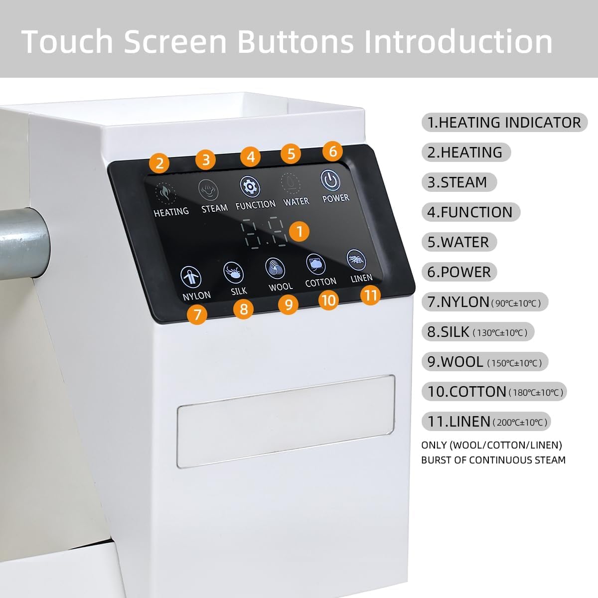 • The Rotary Steam Press features foot pedal control, 5 fabric settings, continuous steam, and high plate pressure for efficient wrinkle removal.