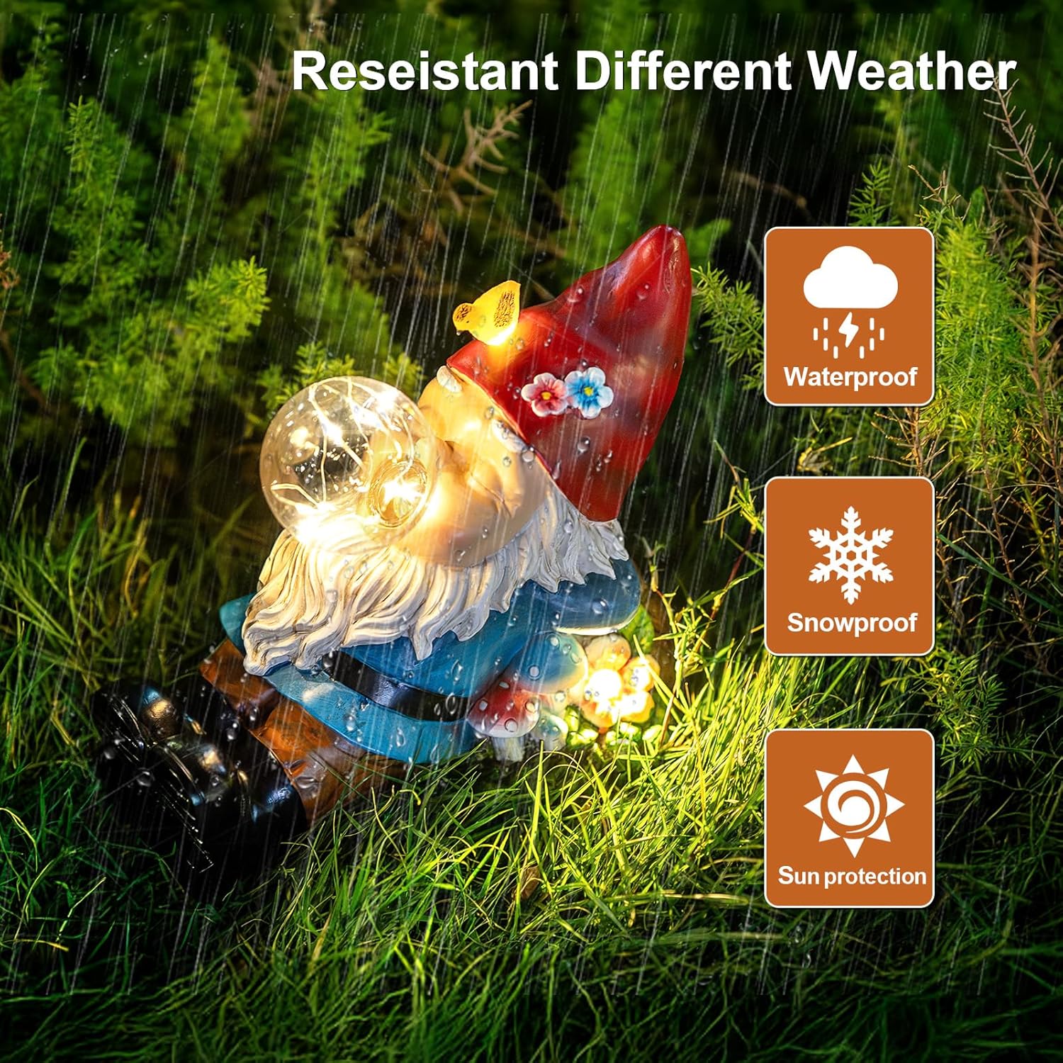 • ☔【Great Material & Weather Proof】Garden gnome decorative lights will accompany you for a long time and give you a lot of fun. Our fairy garden accessories yard decor are made of high quality resin material, waterproof, cracking and fade resistant could work well even in heavy rain or snowstorms.