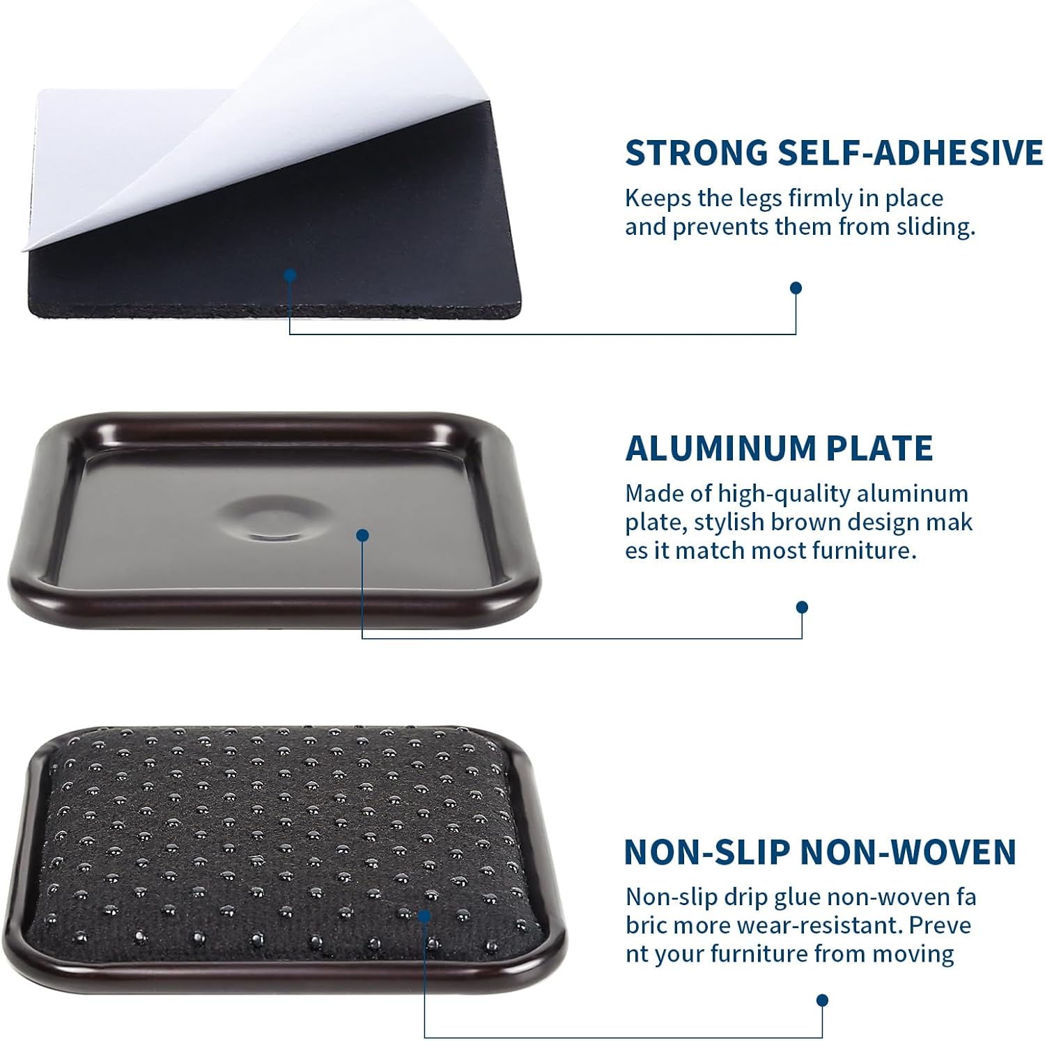 • 【Easy Installation】Step 1: tear off the white cover and press self-adhesive onto the surface of the aluminum plate. Step 2: slide them under your furniture legs and leave them for 10 minutes. Step 3: done.