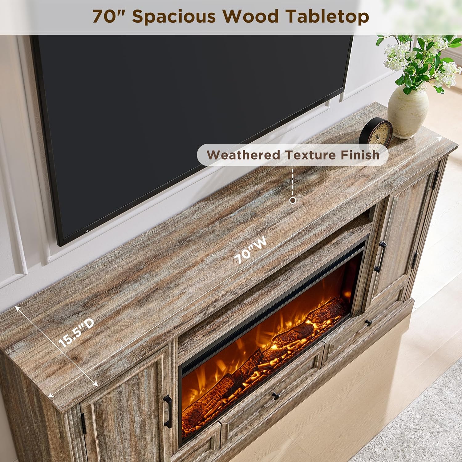 • Cozy Farmhouse Elegance: This 70 inch TV stand blends rustic farmhouse style with a cozy, welcoming atmosphere. The weathered oak finish exudes vintage farm charm, while clean, decorative line details and framed accents add a refined country touch to any room. At the heart, the realistic electric fireplace features flickering flame, glowing log, and smoldering ember, creating a warm, inviting atmosphere. It's the perfect focal point for any room, elevating your home with both style and comfort