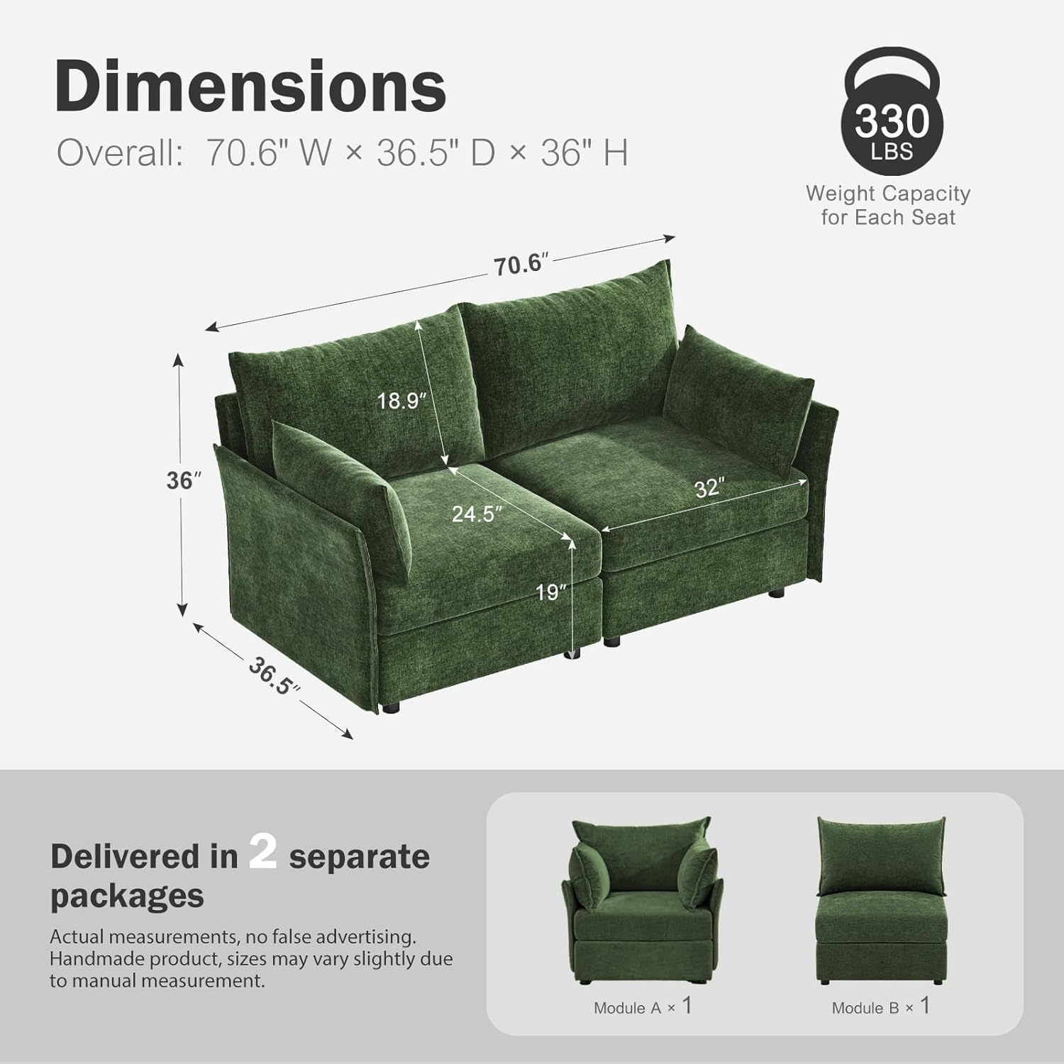 • 💡 Stylish and Spacious Sectional Sofa - A blend of modern elegance and comfort, this green sofa is ideal for contemporary interiors. Customize seating and shape by adding or removing modules to fit your needs. It's perfect for your living room, family room, bedroom, or office. Overall size: 70.6" W × 36.5" D × 36" H, seat width: 32", seat depth: 24.5".
