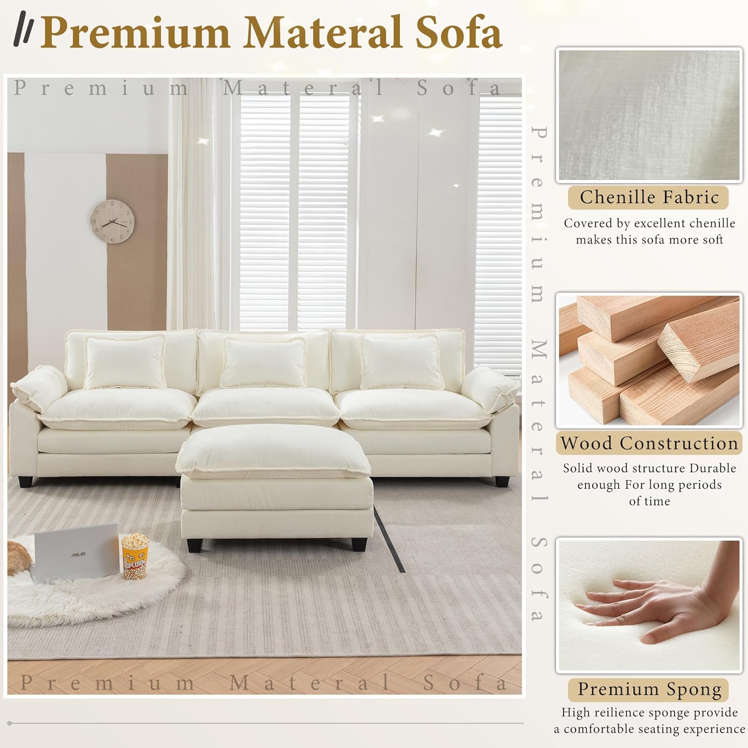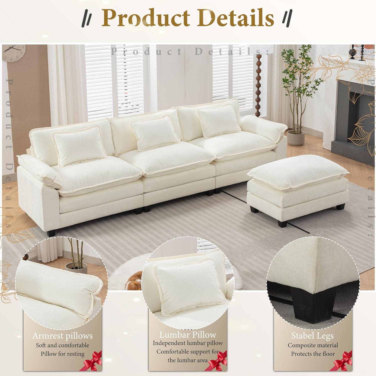 URRED Modular Sectional Sofa Comfy Cloud Couch, Modern Chenille Sofa Sleeper Deep Seat Couches with Ottoman/Pillows for Living Room (White, 117''- L Shape)