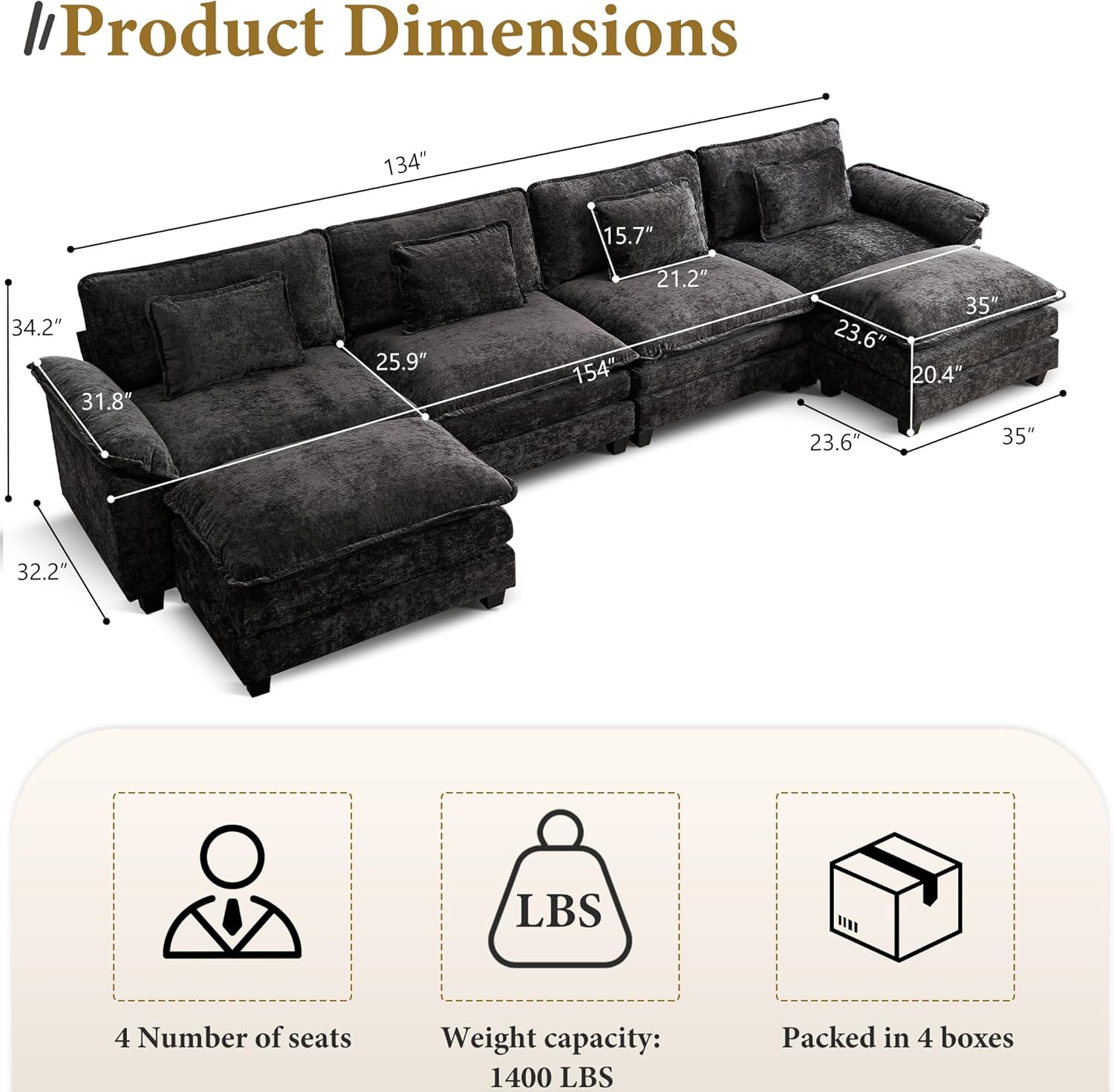 URRED Modular Sectional Sofa Comfy Cloud Couch, Modern Chenille Sofa Sleeper Deep Seat Couches with Ottoman/Pillows for Living Room (Black, 154'' - U Shape)