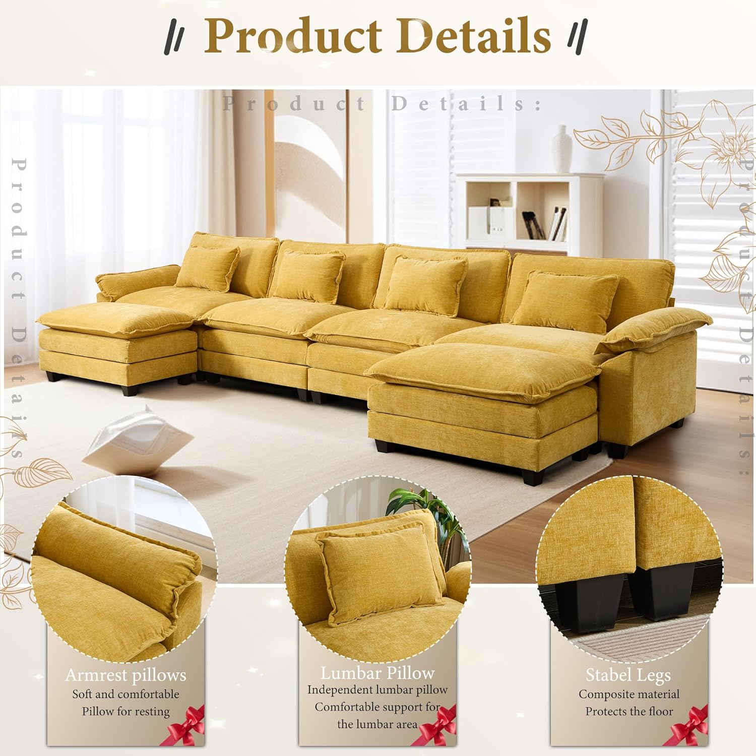 URRED Modular Sectional Sofa Comfy Cloud Couch, Modern Chenille Sofa Sleeper Deep Seat Couches with Ottoman/Pillows for Living Room (Yellow, 154'' - U Shape)